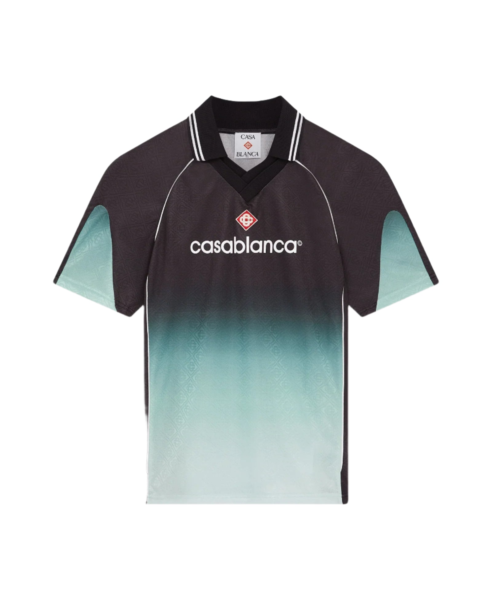 The Casablanca Jacquard Monogram Football Shirt 'Gradient' offers a refined take on retro sportswear, blending luxury craftsmanship with a nod to Tokyo's Park Hyatt aesthetic. Crafted from gradient jacquard monogram fabric, this short-sleeve shirt features a ribbed collar, the brand's signature diamond logo patch, and a Casablanca logo across the chest.