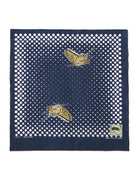 • This bandana showcases a charming twin swallowtail motif, featuring two mirrored swallowtail butterflies set against a playful dotted background pattern. The design embodies Kapital’s signature fusion of whimsy with traditional motifs.