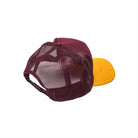 Striking two-tone colourway: vivid red foam front and breathable gold mesh back paired with a rich golden brim