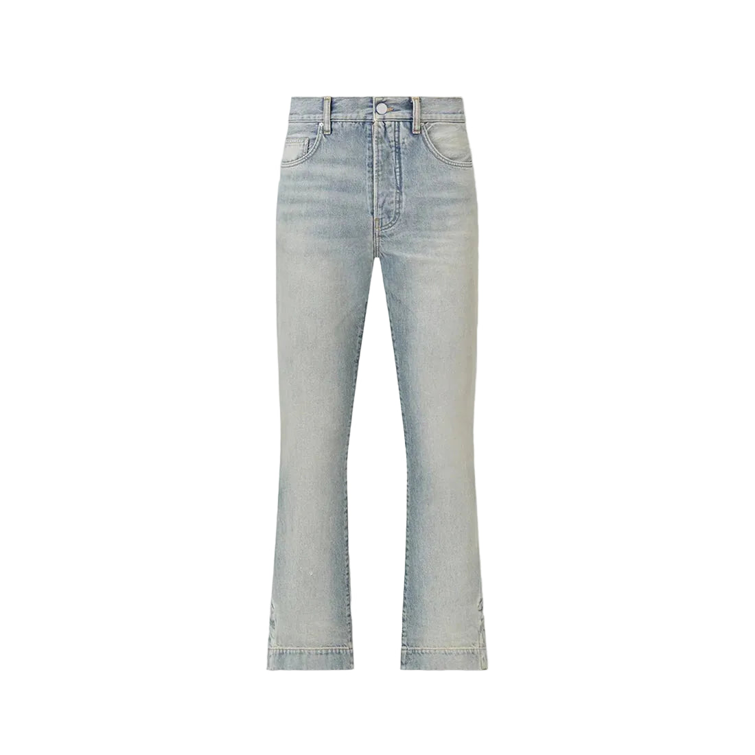 The Amiri Straight Flare Jean in 'Antique Indigo' from Pre-Fall 2025 reworks signature house denim with a flared silhouette, five-pocket construction, and hidden ankle snap buttons for a custom fit.