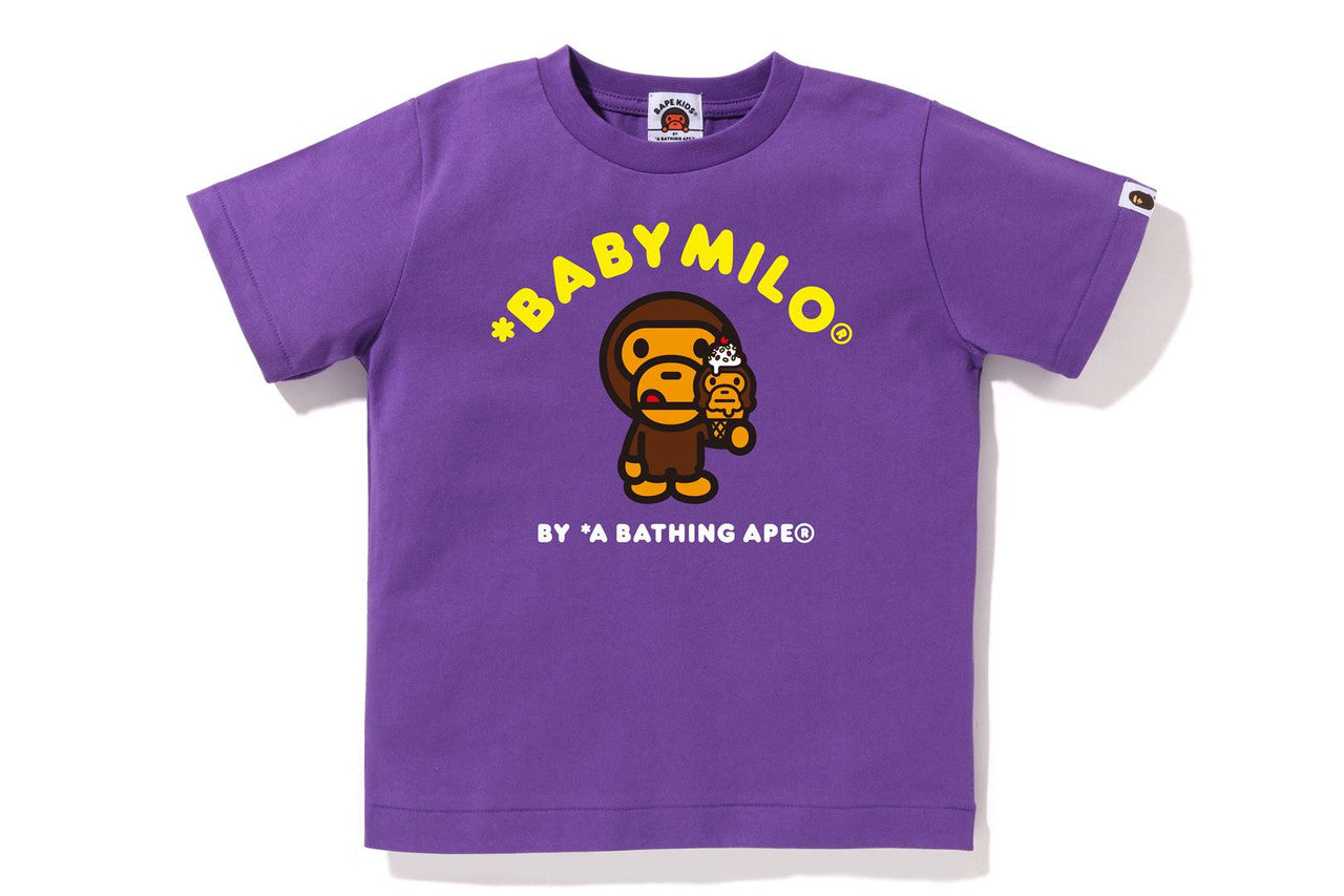The Bape Kids Baby Milo Ice Cream Tee 'Purple' brings playful streetwear style to little ones. Featuring Baby Milo enjoying ice cream, this tee combines fun graphics with everyday comfort.