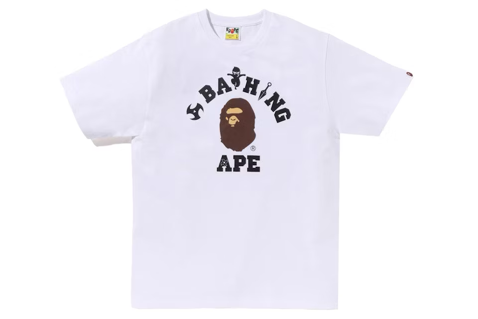 White tee featuring a “Ninja College” graphic on the front in signature Bape styling, with subtle branding accents.