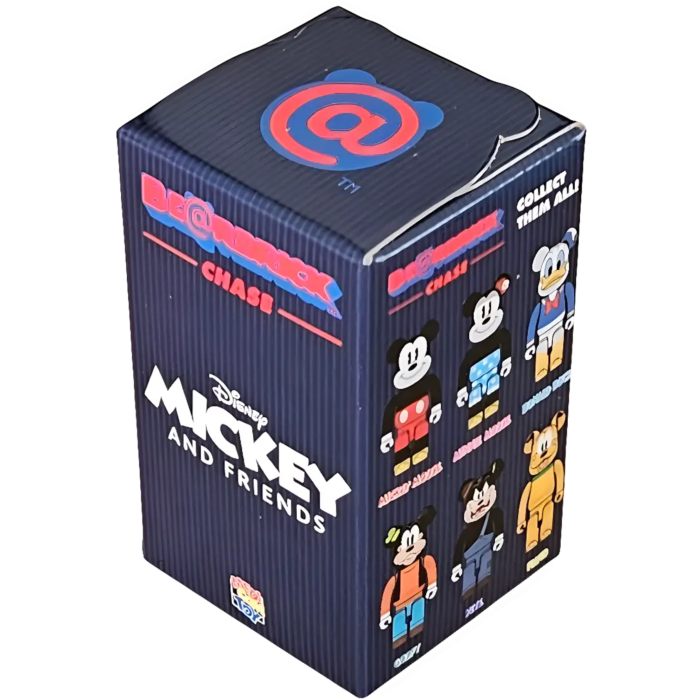 Contains one 70 mm (100%) BE@RBRICK figure in sealed foil packaging, with a mystery design from the Mickey Mouse & Friends Chase Series—expect characters like Mickey, Minnie, Donald, Goofy, Pluto, Pegleg Pete, and the ultra-rare Black-and-White secret chase Mickey Mouse variant