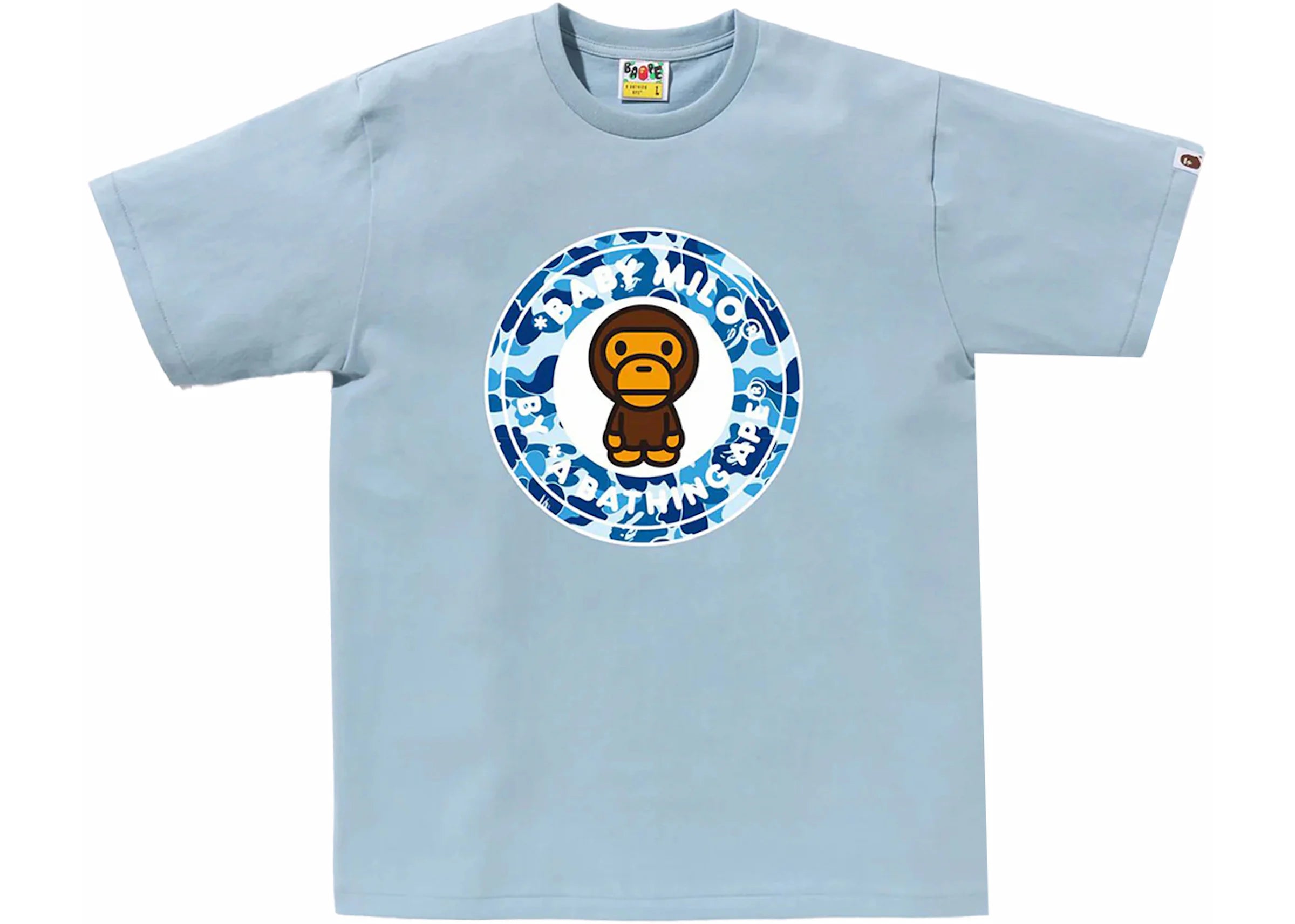 The Bape ABC Camo Milo Busy Works Tee 'Sax Blue' delivers playful energy with a streetwear edge. Featuring Baby Milo set against Bape’s signature ABC camo and Busy Works logo, this tee combines bold graphics with a fresh pastel backdrop for a standout everyday piece.