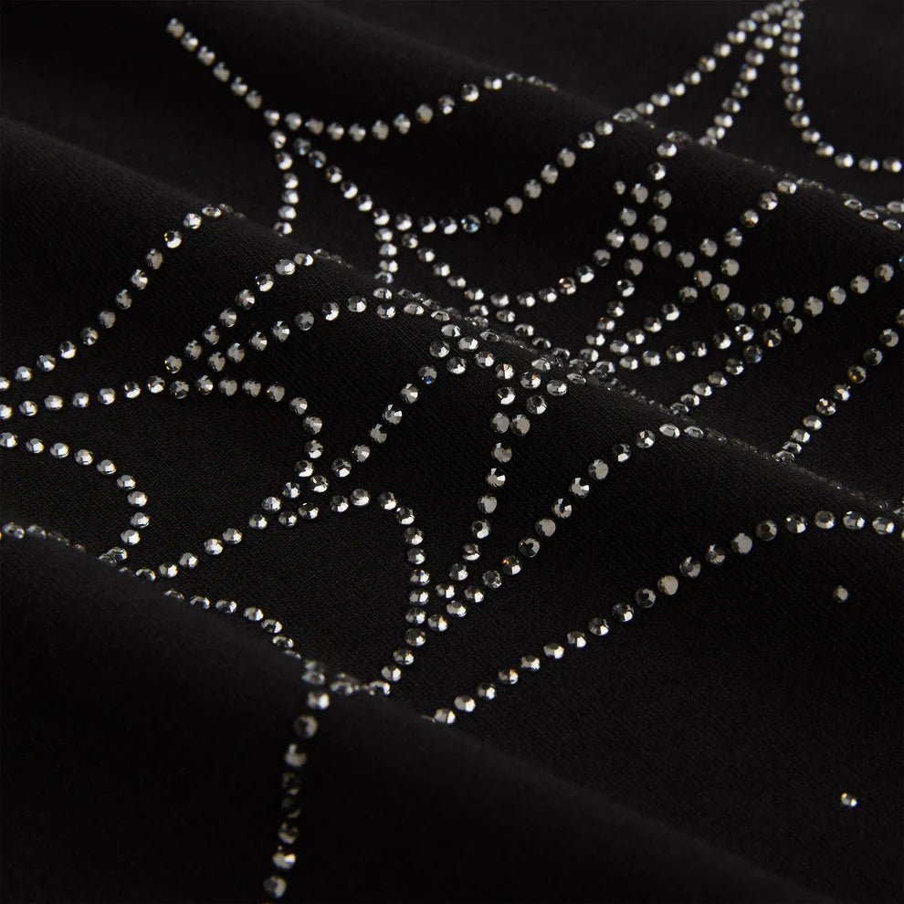 Elevate your streetwear wardrobe with the Rhinestone Silk Tee in Black from SP5DER. Featuring lightweight cotton and standout rhinestone-embellished graphics on both front and back, this tee fuses subtle luxe with bold detail — perfect for everyday wear with a luxe twist.
