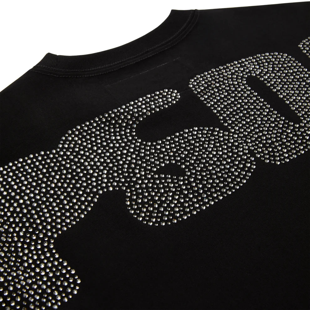 Bold rhinestone-embellished graphic detailing on front and back, adding texture and glamour.