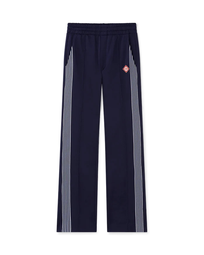 Relaxed-fit track pants in midnight sail navy with side stripe detailing, elastic waistband with drawstring, and subtle Casablanca branding for a polished streetwear look.