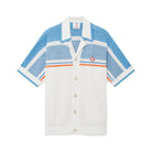 The Casablanca Cotton Tennis Crochet Shirt in Blue reimagines classic tennis attire with a luxurious twist, embodying the brand's signature blend of elegance and urban edge. Crafted from 100% cotton in a crochet knit, this short-sleeve shirt offers a relaxed fit, making it a versatile addition to any wardrobe. The design features an open collar, front button closure with signature gold-rimmed pearl buttons, and front patch pockets, adding a touch of sophistication to the classic silhouette. Stripe details across the shoulders, chest, and sleeves, along with striped edge detailing on the collar and cuffs, enhance the shirt's athletic-inspired aesthetic.