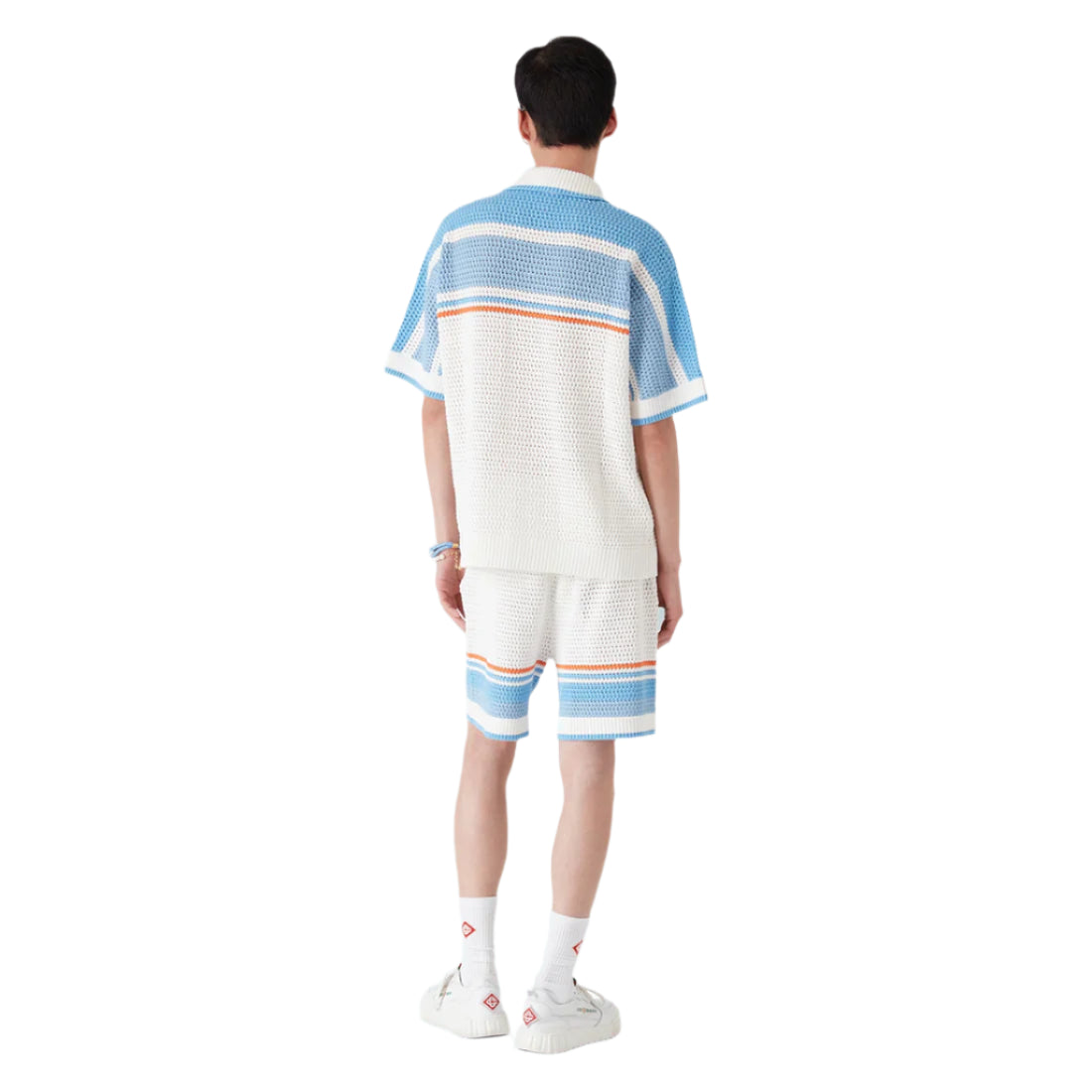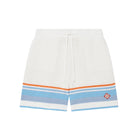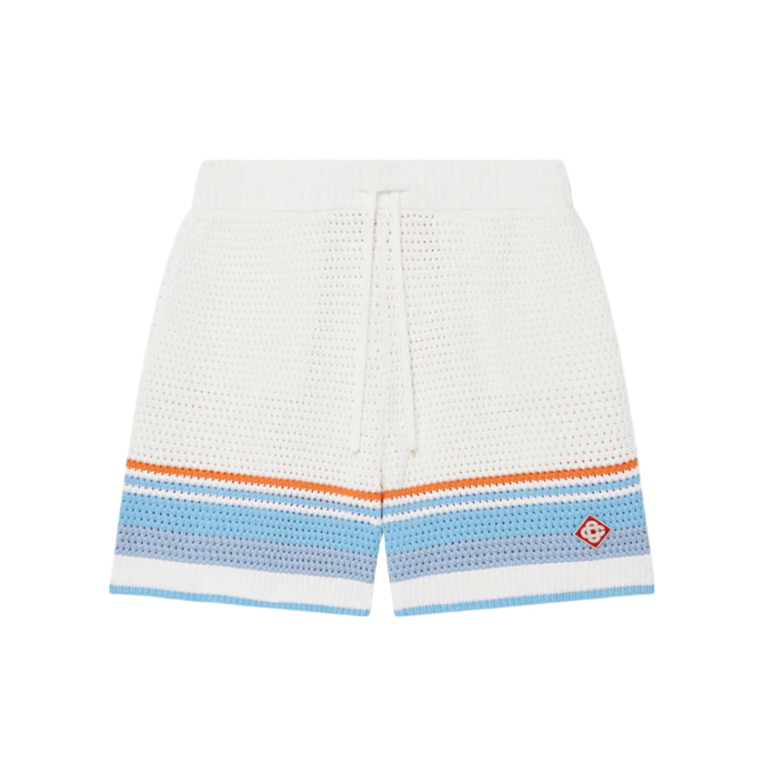 The Casablanca Faux Crochet Shorts in Blue Multi elevate classic sportswear with a luxurious twist, embodying the brand's signature blend of elegance and urban edge. Crafted from 100% cotton in a crochet knit, these shorts feature a relaxed fit, making them a versatile addition to any wardrobe. The design includes an elasticized waistband with a drawstring fastening, side seam pockets, and a distinctive striped hem detail. An embroidered diamond logo patch at the hem adds a touch of brand identity.