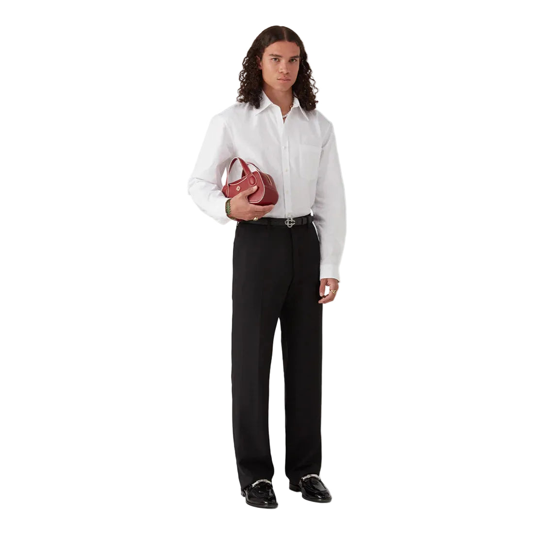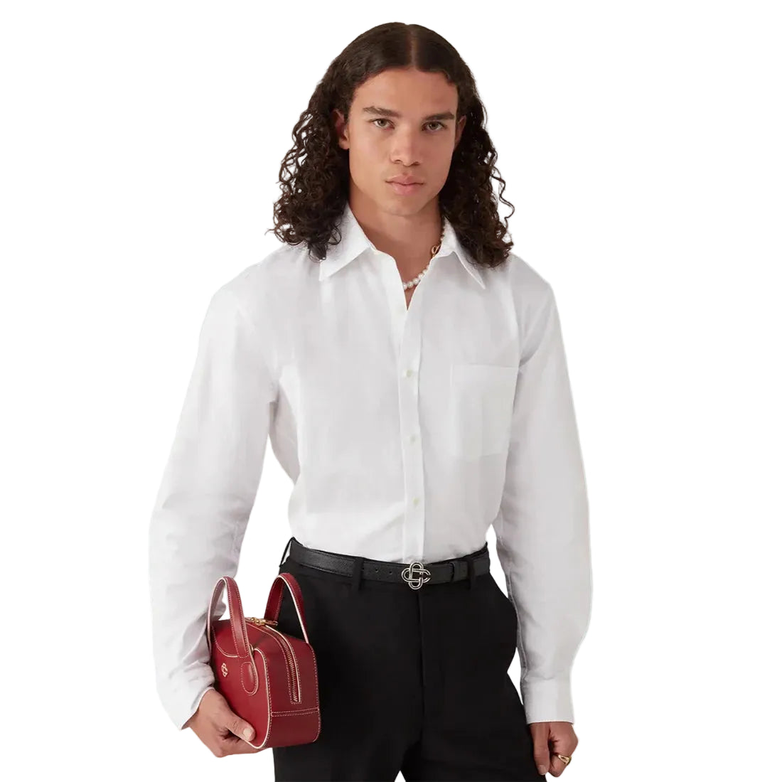 The Casablanca Monogram Oxford shirt in 'White' is a classic long-sleeve style, finished with a chest pocket, point collar, button fastening, interlocking CC corozo buttons, and a curved hem.