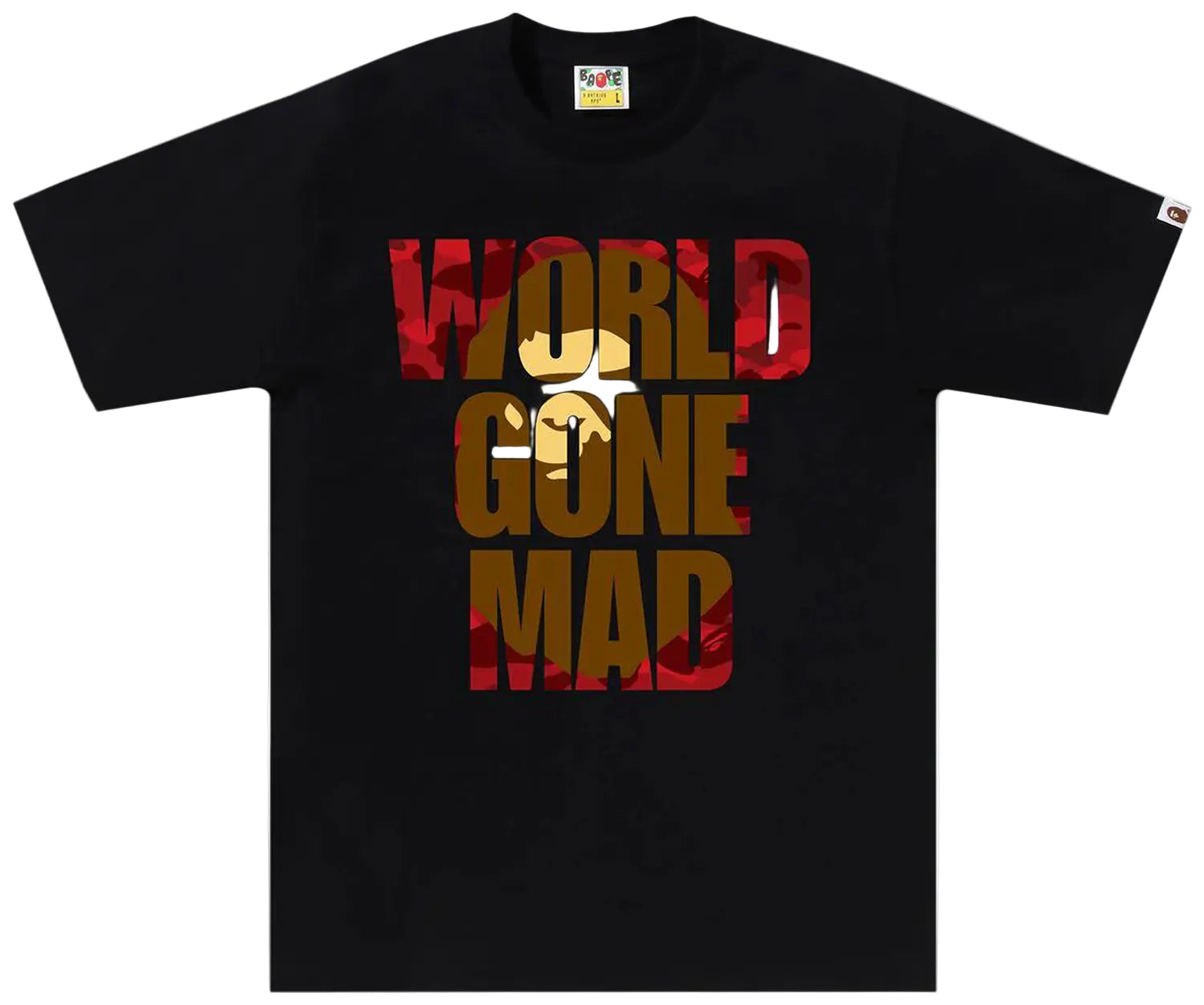 Features a striking colour-camo overlay of the “Ape Head” motif layered within “WORLD GONE MAD (WGM)” styling — bold, eye-catching and unmistakably BAPE.
