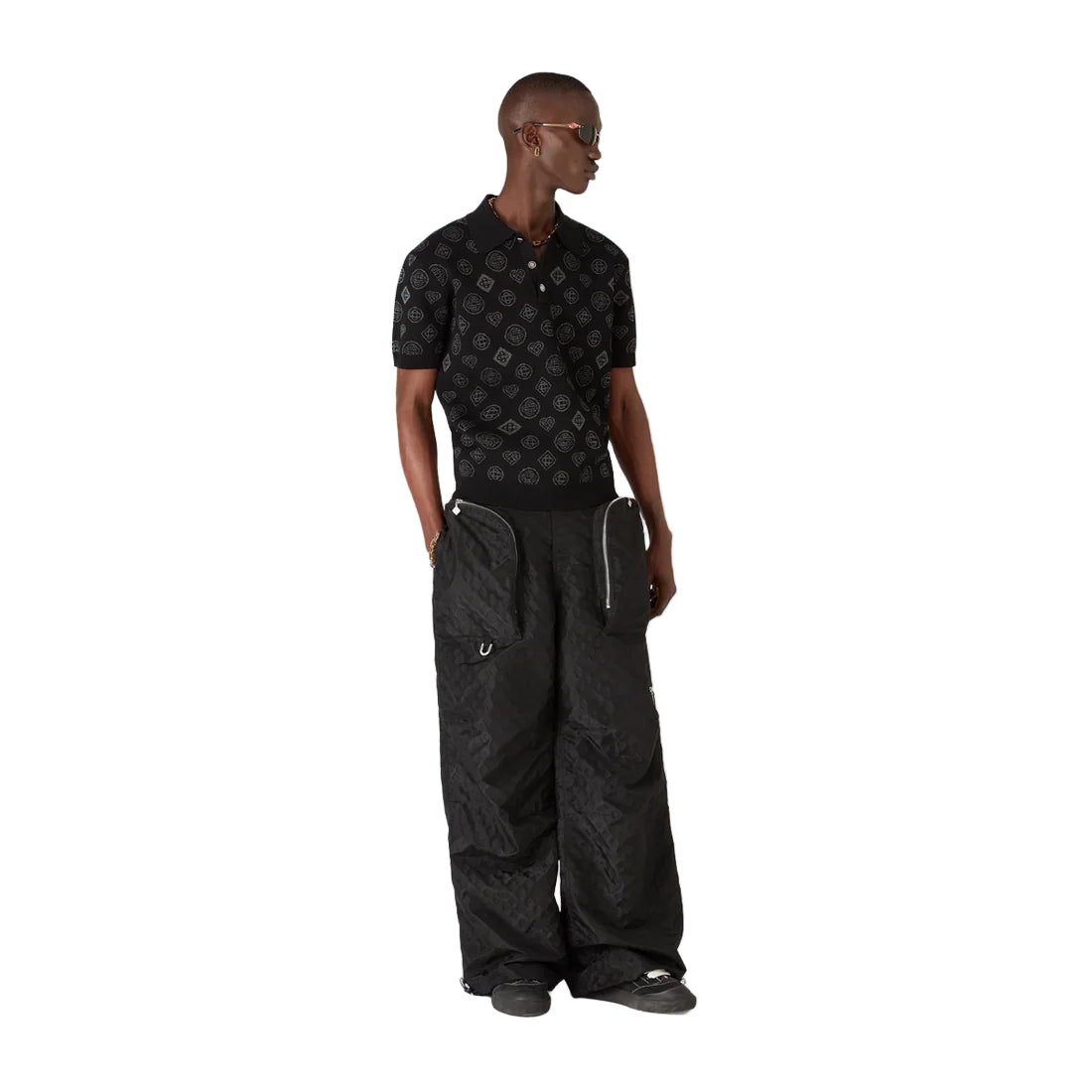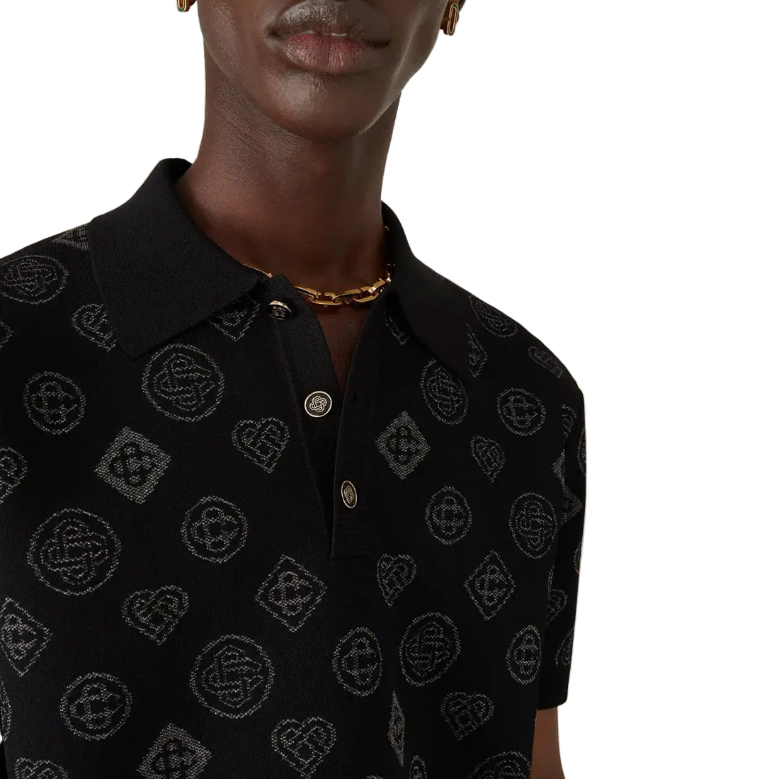 Elevate your casual lineup with the City Jacquard Polo in 'Black' by Casablanca — a striking blend of modern streetwear and signature monogram flair. Cut from jacquard fabric with the House’s interlocking Honeydew motif repeated across the piece, this short-sleeve polo delivers a sharp, slim silhouette with premium detailing. Gold-rim enamel buttons with the subtle “CC” insignia up the luxury factor. Ribbed collar, cuffs, and hem give structure while maintaining comfort and polish.