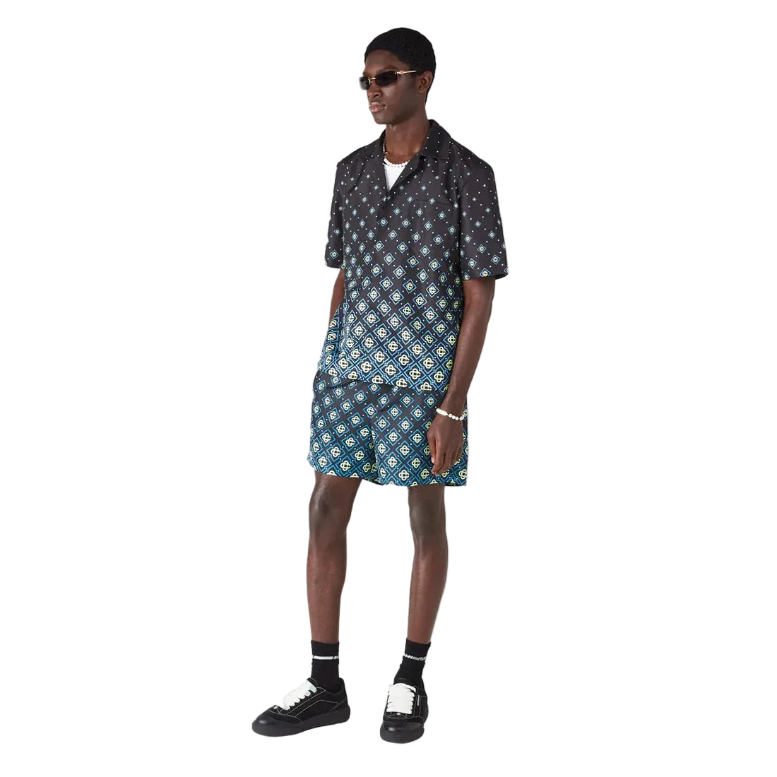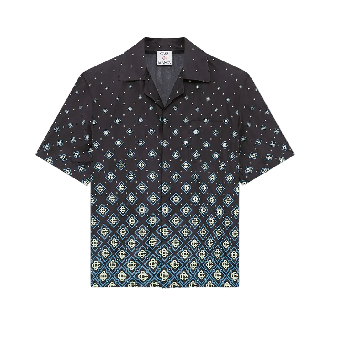 The Casablanca Monogram Swim Shirt in 'Black' is crafted from technical swim fabric and features the house’s signature monogram pattern. Finished with short sleeves, a button-front closure with interlocking CC logo corozo buttons, and refined detailing, it reflects the brand’s elevated take on swimwear.