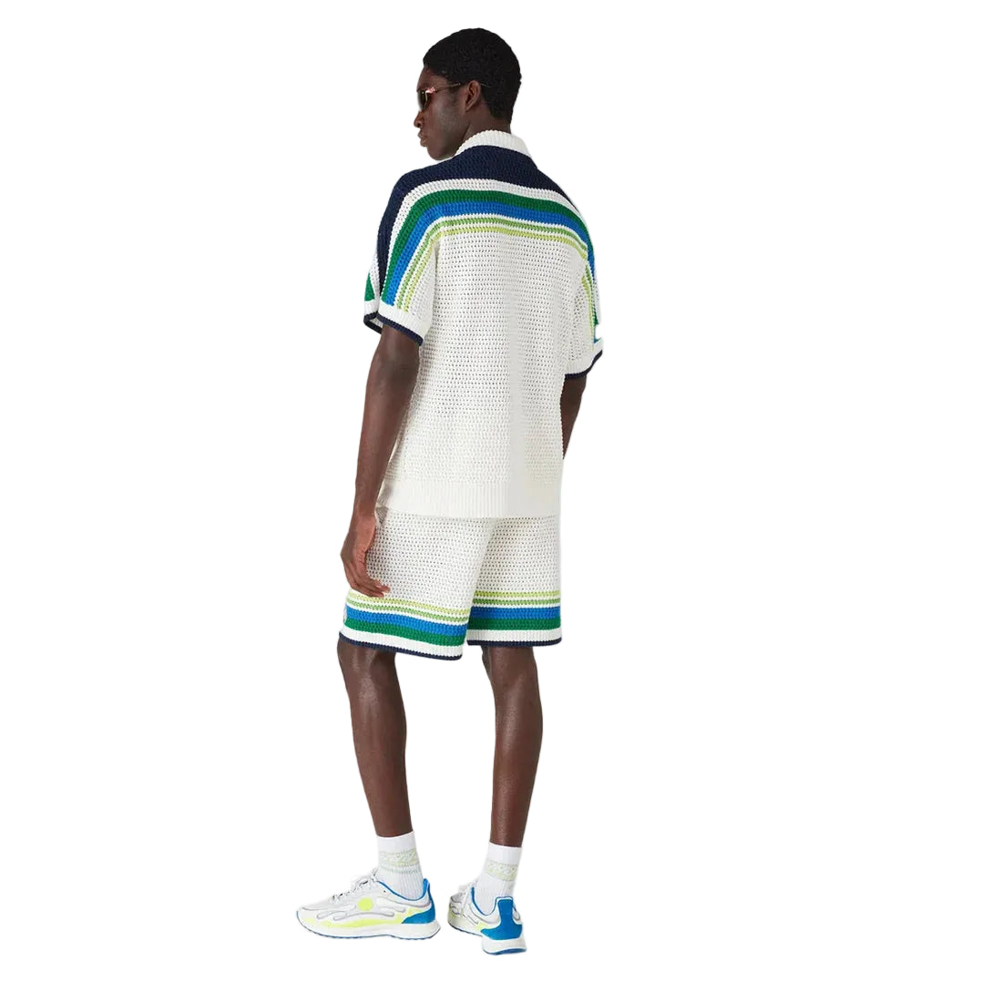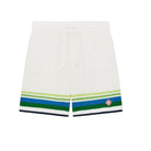 The Casablanca Stripe Knit Shorts in 'White Blue' are crafted from soft crochet cotton, featuring the signature tennis stripe in natural tones. Completed with a ribbed elastic waistband with drawstring, side pockets, and a relaxed fit.