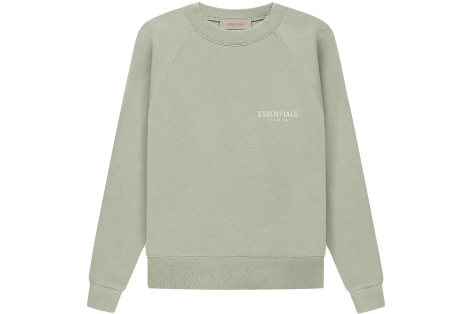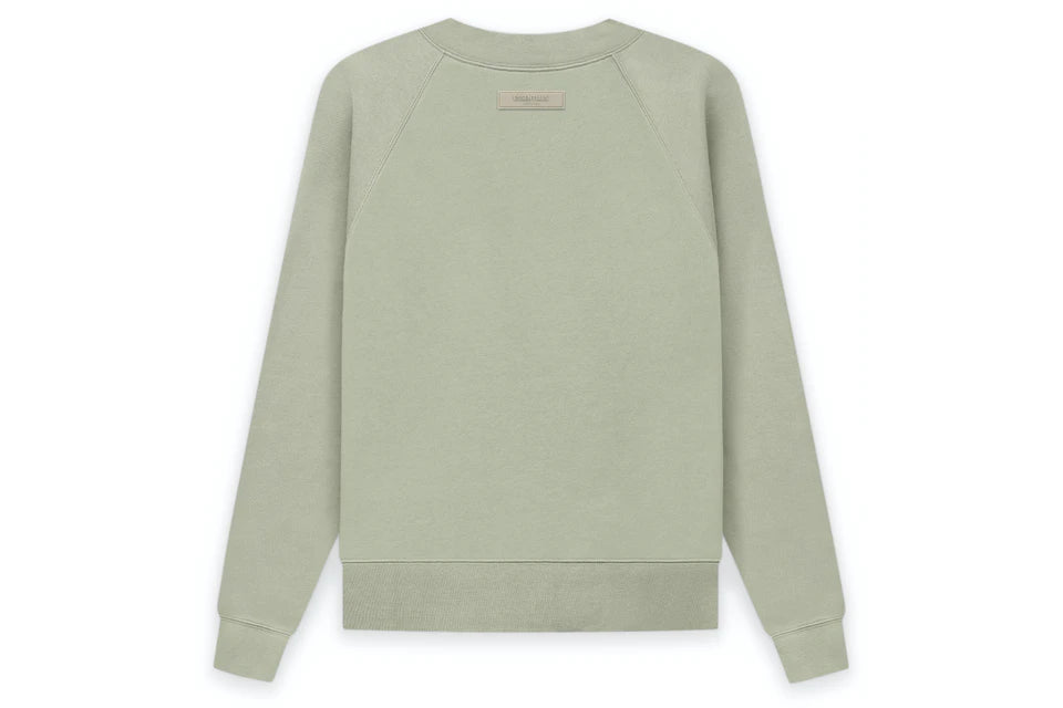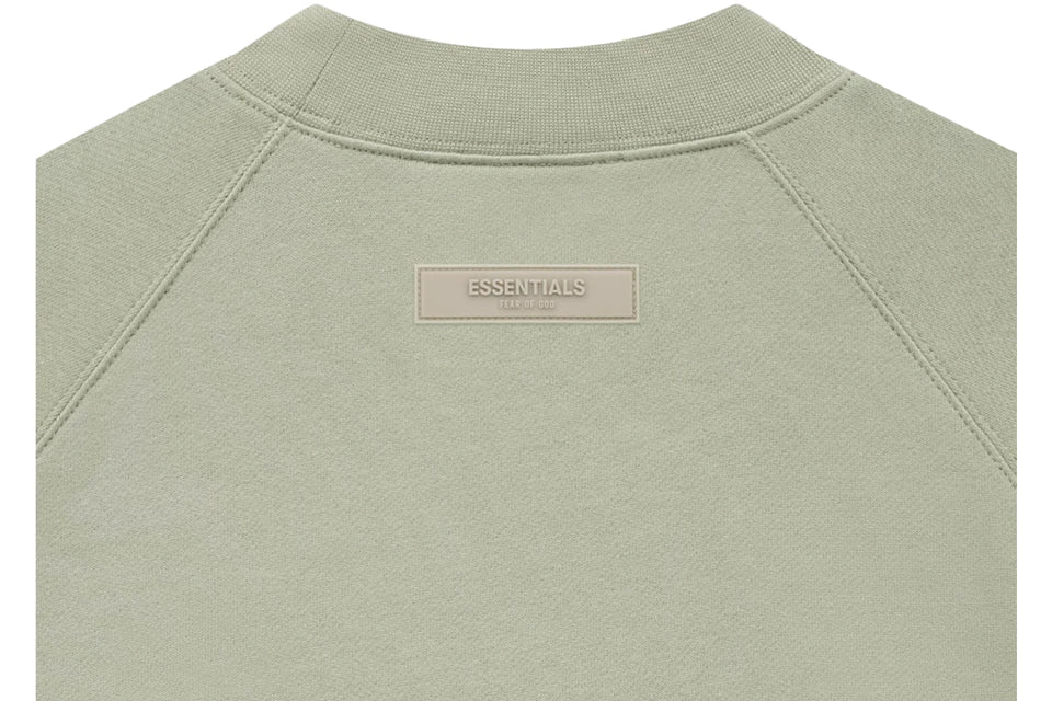 Get the Essentials Crewneck ‘Seafoam’ by Fear of God — premium cotton-rich fleece in a mint green hue, relaxed crew pullover with bold logo branding and ribbed trims.