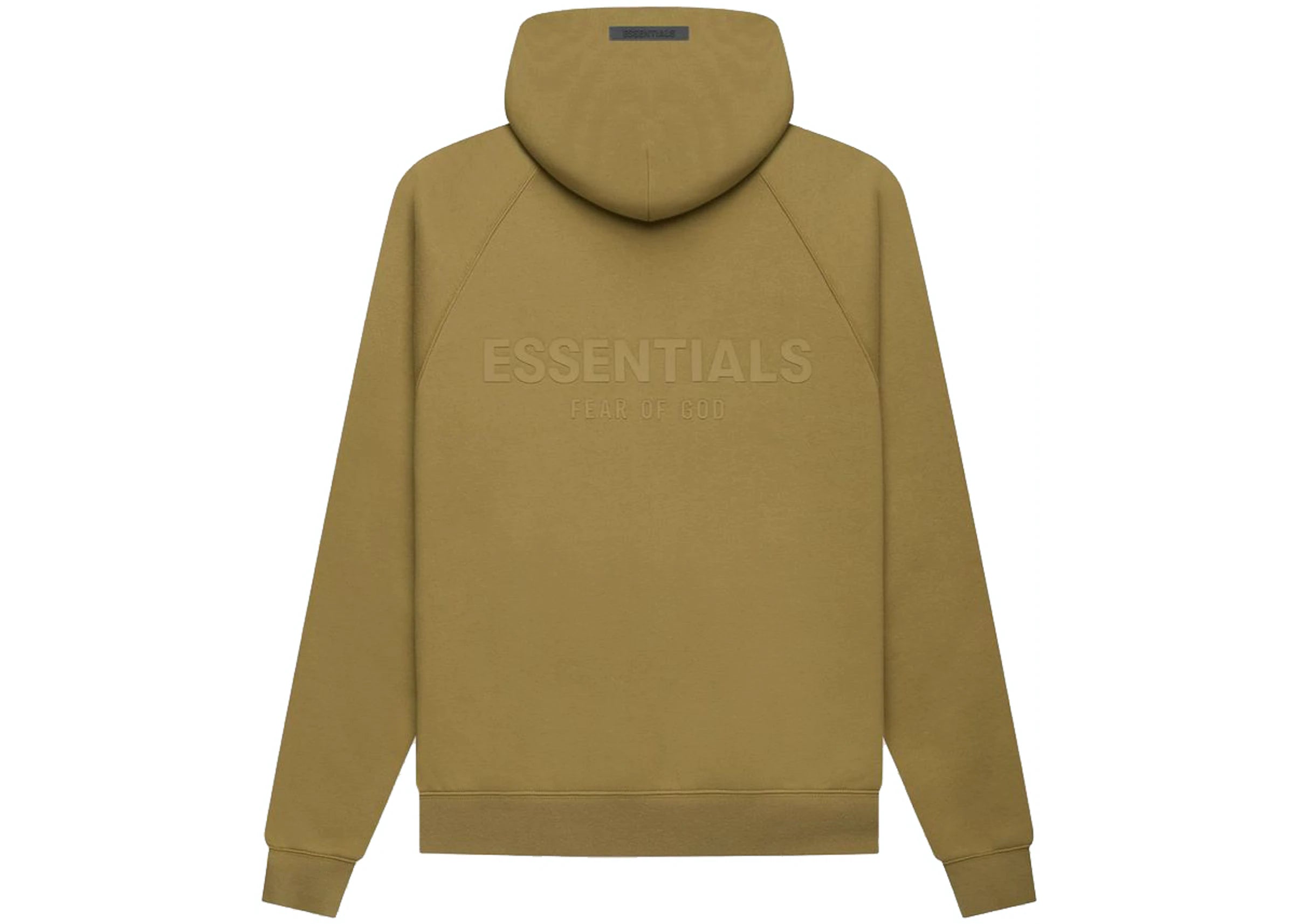 Fear of God Essentials Pullover Hoodie “Amber” (FW21) – premium heavyweight fleece pullover in rich amber tone with boxy relaxed fit, classic Essentials branding, ideal for streetwear layering.