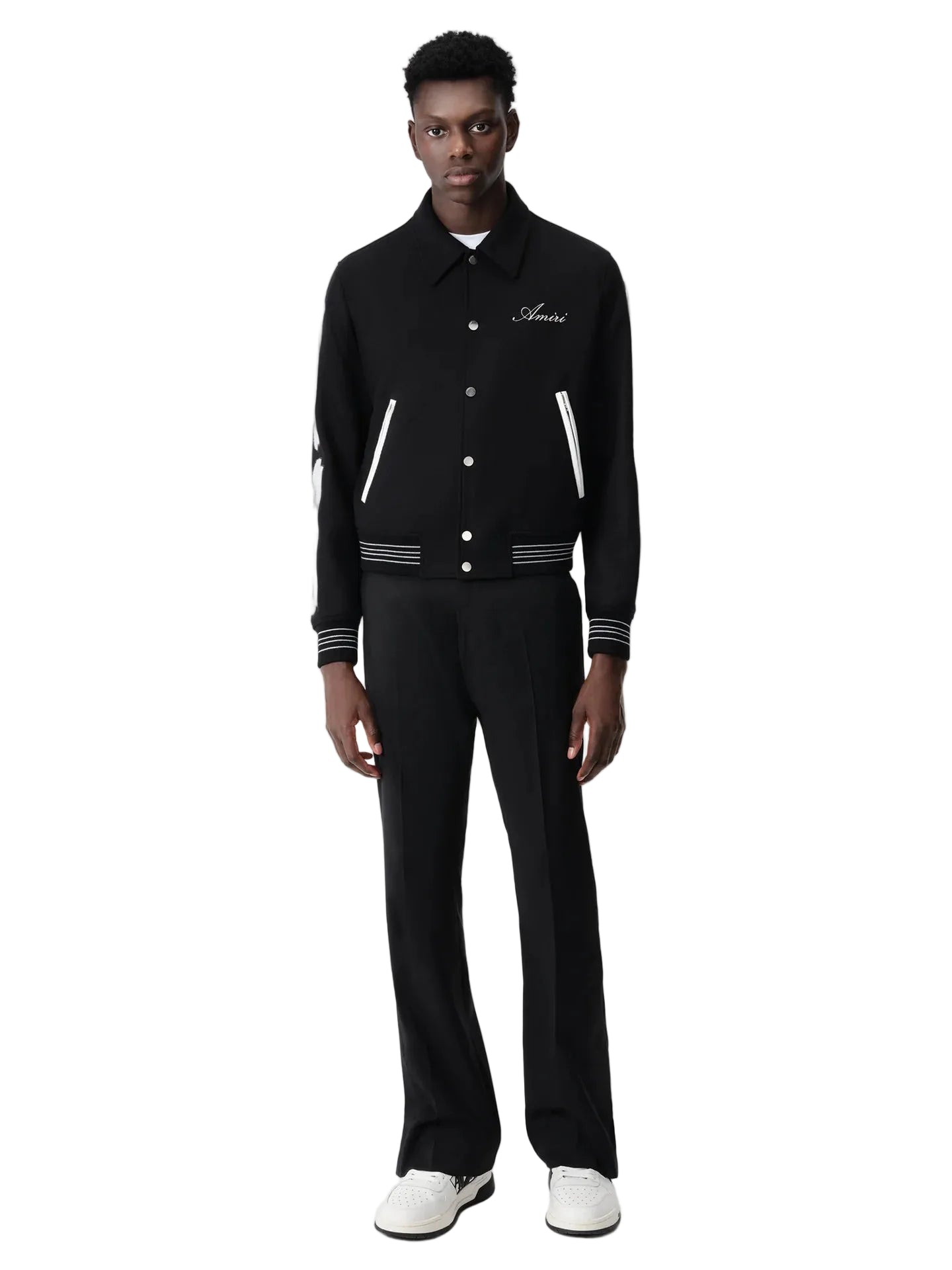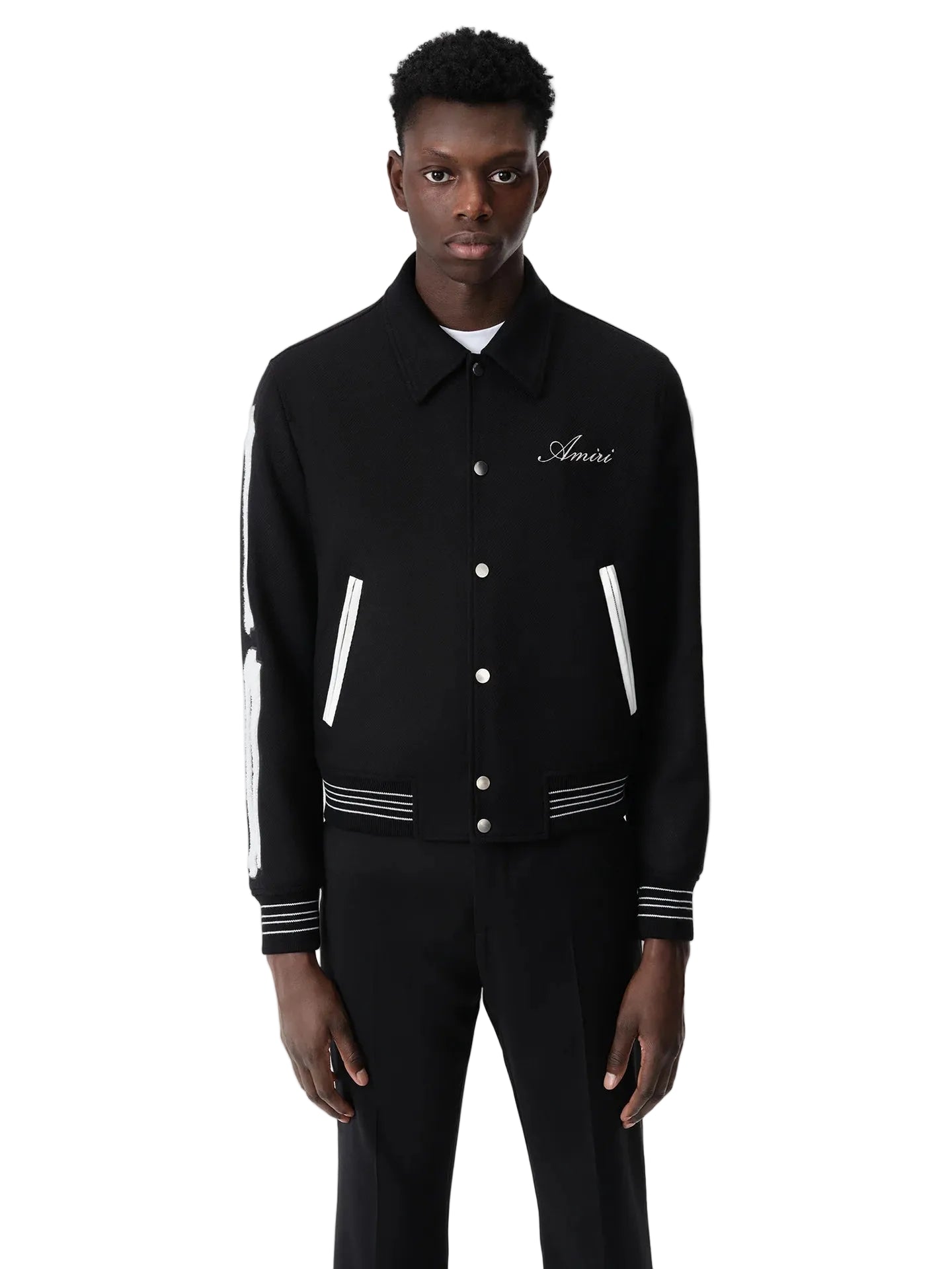 The Amiri Bones Varsity Jacket in 'Black' blends iconic Americana with a rebellious rock-inspired aesthetic. Crafted in wool with chenille bone applique detailing finished with welt zipper pockets. Banded rib accents and classic snap front closure accentuate the classic embroidered house script logo.