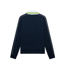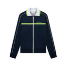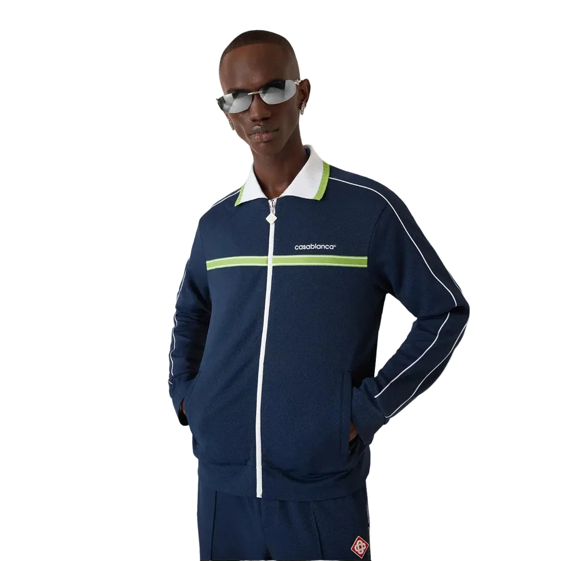 The Casablanca Round Piqué Track Jacket in 'Navy' is a long-sleeve sportswear staple featuring the Casablanca logo, a zip closure with diamond logo pull, ribbed collar, green and white chest stripes, piping along the shoulders and sleeves, a lined interior, and ribbed cuffs and hem.