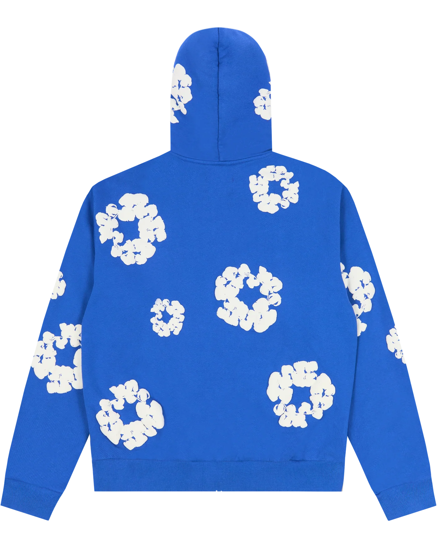The Denim Tears Cotton Wreath Zip Hoodie 'Blue' blends streetwear aesthetics with cultural storytelling. Featuring the brand's signature puff-printed wreath motif on a rich blue base, this hoodie offers both comfort and a statement look.