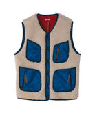 This distinctive vest features a bonded boa fleece outer in a natural “kinari” shade, enhanced with vibrant blue nylon trim and pocket panels that create a striking visual contrast.