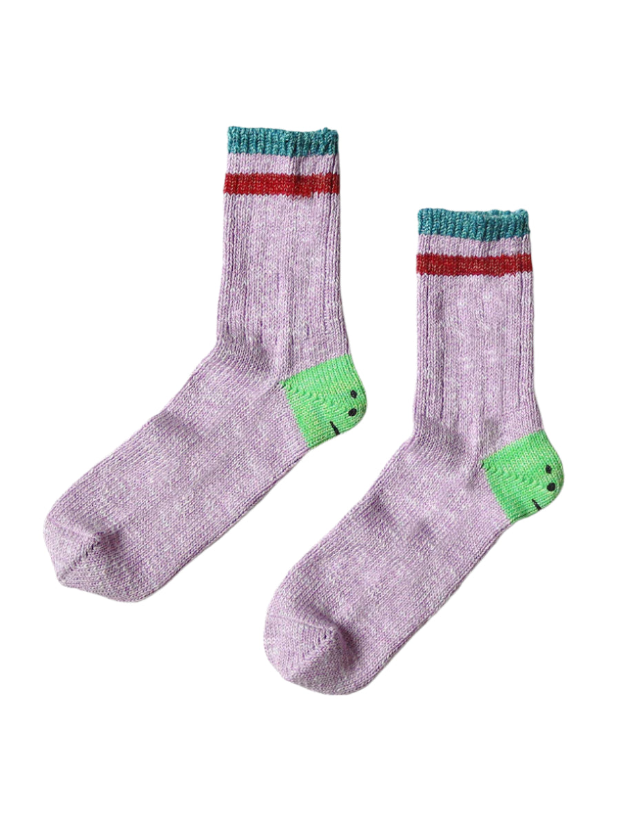 These mid-calf socks showcase a vibrant, smiley-face accent on the heel—true to their “Rainbowy Happy Heel” name—and are available in an array of striking colorways, including White x Green, White x Pink, Beige x Pink, Purple x Green, Purple x Pink, Orange x Pink, and Saxophone x Green.