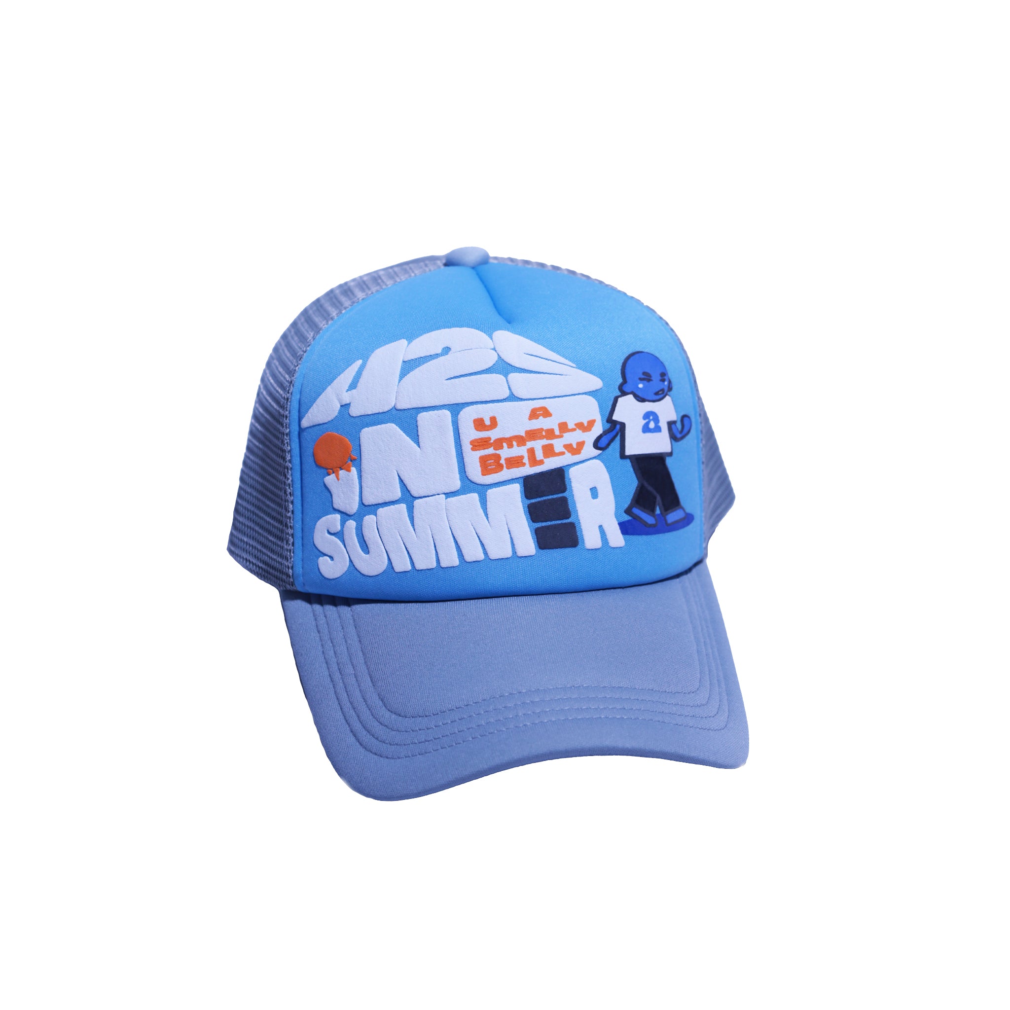 Discover the HEAD2SOLE Trucker Cap, a perfect blend of casual charm and playful design. This cap features a unique puff print with the statement "H2S In Summer," complementing the laid-back vibe of the season. Designed in our signature baby blue, it boasts a contrasting grey brim and mesh for a fresh, modern look. Topping off the design is a quirky touch – an illustration of a person in a HEAD2SOLE t-shirt humorously proclaiming "u a smelly belly."