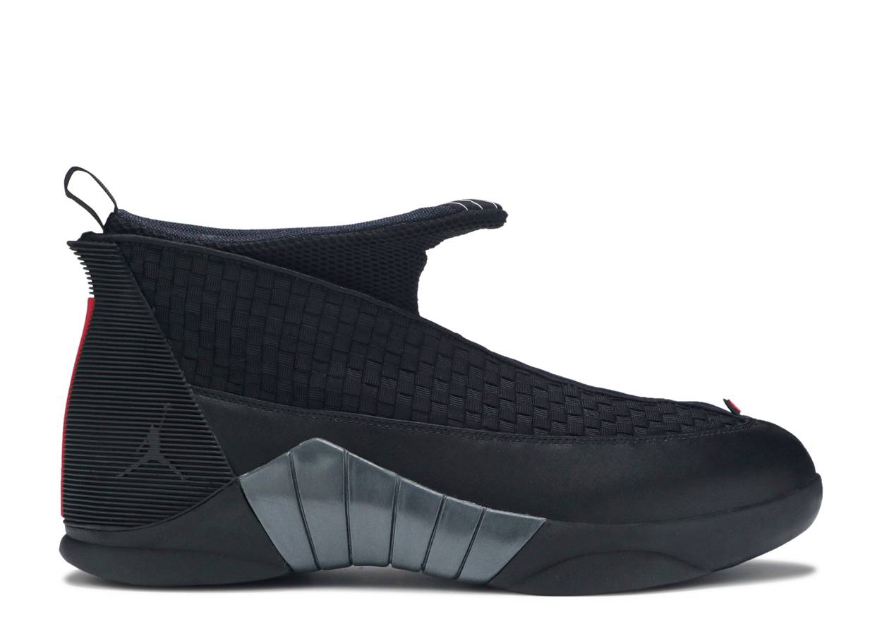 The Air Jordan 15 'Stealth' 2017 features a blacked-out colourway inspired by the X-15 fighter jet. The full-grain leather upper has a woven crosshatch pattern, with a tonal protruding tongue. A pebax heel counter is supported by a varsity red heel strip.