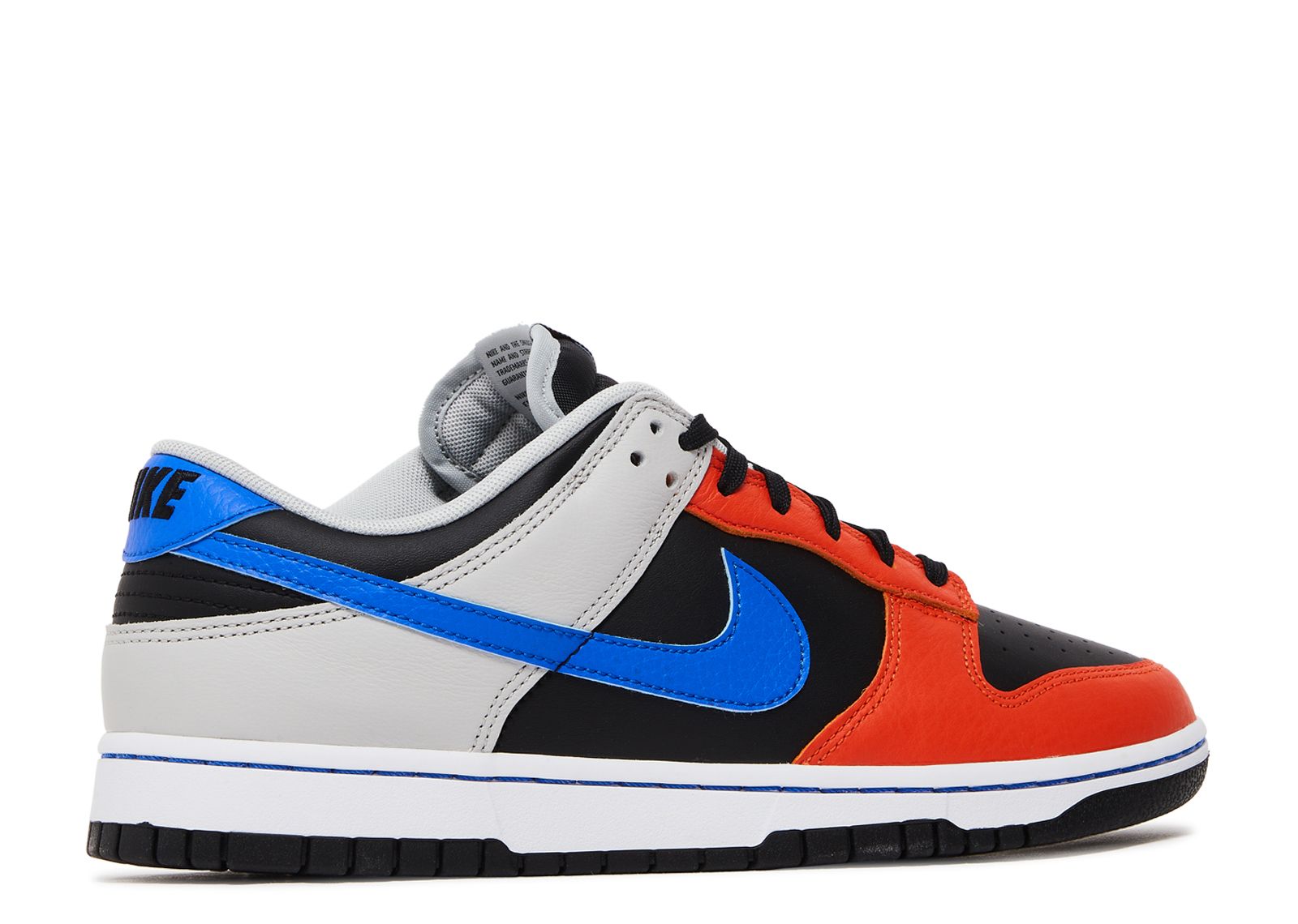 The NBA X Dunk Low EMB '75th Anniversary - Knicks' celebrates the NBA's 75th anniversary with a leather upper in black, orange, and grey. Royal blue accents the swoosh and back tab, while a woven tongue tag features 75th-anniversary and NBA logo branding.