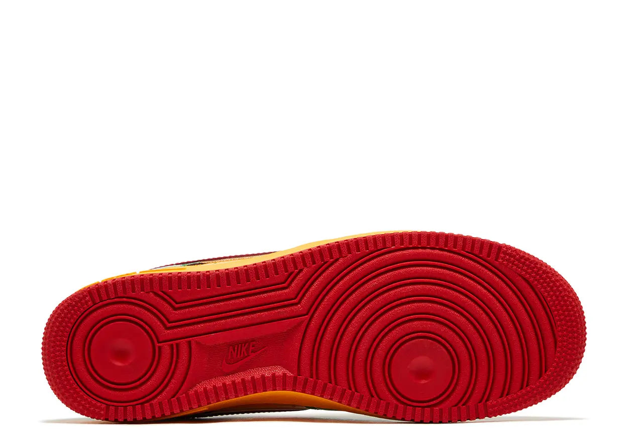 The Lil Yachty x Air Force 1 Low Concrete Boys 'Lucky Green' rocks gold and green hues on the glossy patent leather upper. The red swoosh is piped in a green trim for an eye-catching look. A nod to Lil Yachty's rap collective, a 'Concrete Boys' signoff is stamped on the back tab, while their embroidered logo decorates the heel area. Another signoff reads 'It's Us' on the tongue tag as well as the insoles.