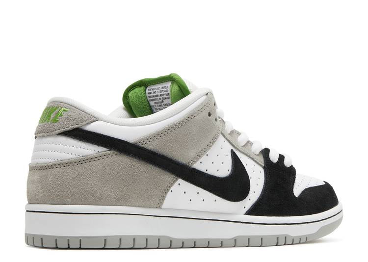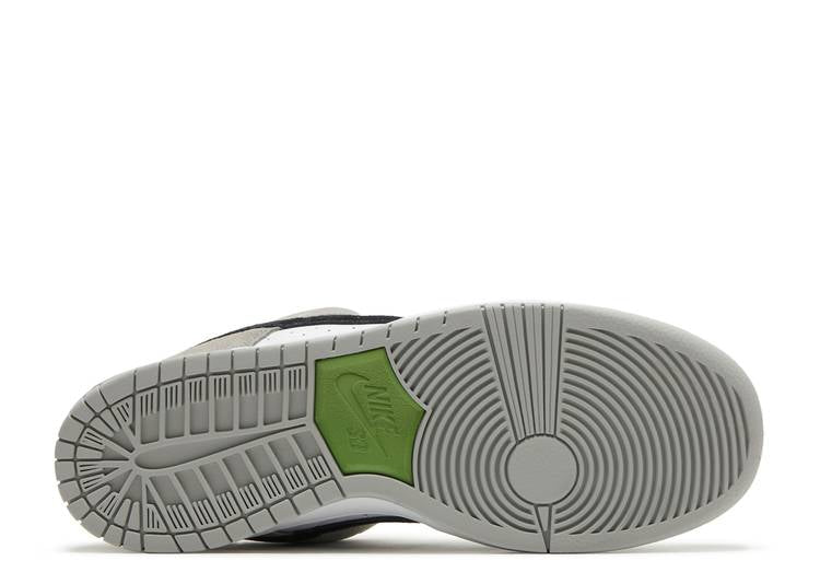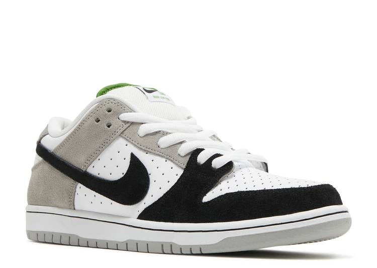 Inspired by the original Nike Air Trainer 1 Chlorophyll, the SB Dunk Low features a white perforated leather upper with grey and black suede overlays. Green accents on the heel and lining add contrast, while a white zoom air sole completes the design.