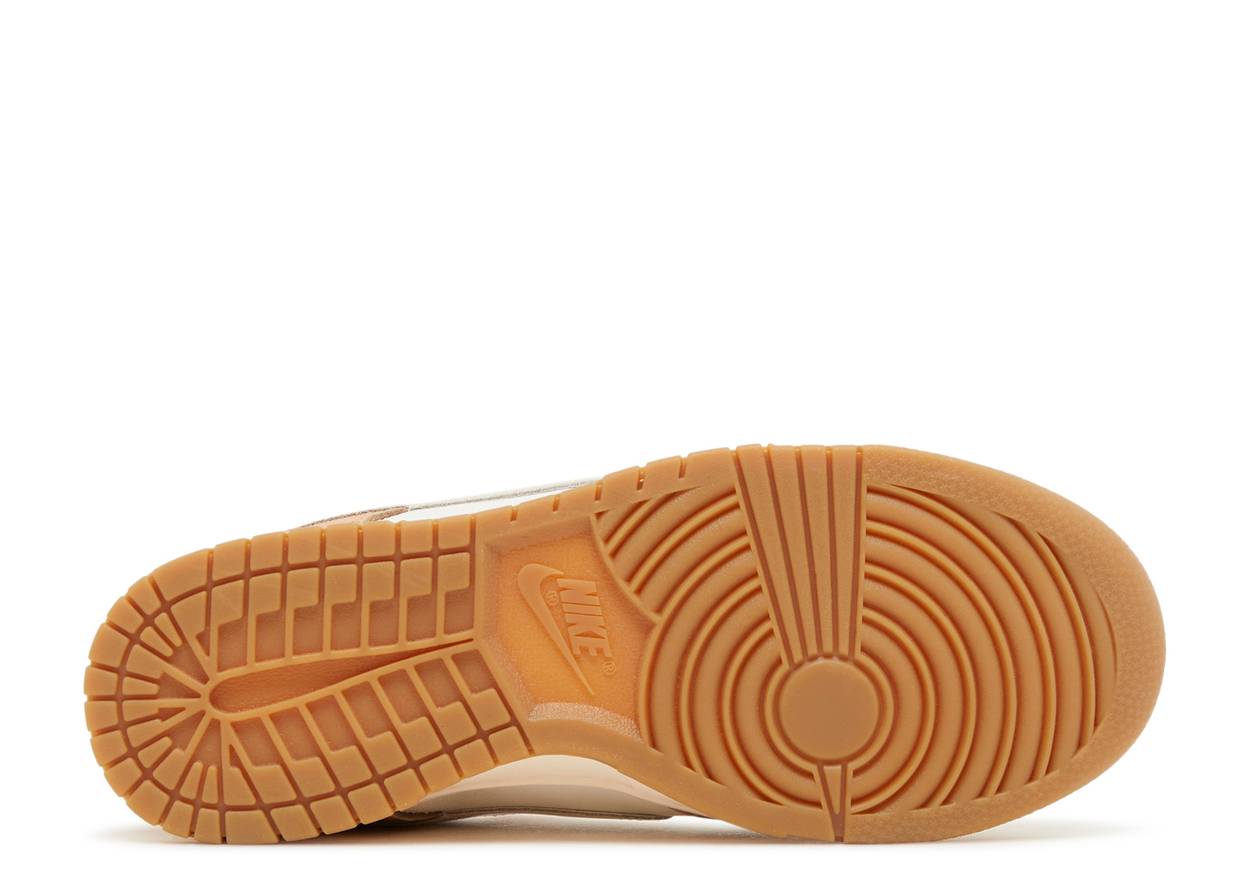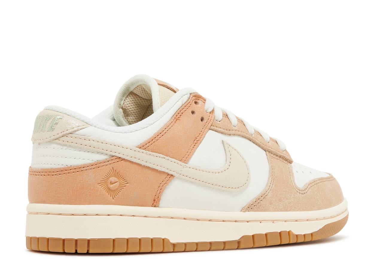 The Dunk Low 'Australia' (WMNS) features cracked rosy beige overlays on an ivory leather base. A tan leather swoosh decorates the side, while a swoosh graphic appears on the lateral heel. The soft pink midsole contrasts with a durable gum rubber outsole, and gilded lace dubrae and Nike AU tongue tags add finishing touches.