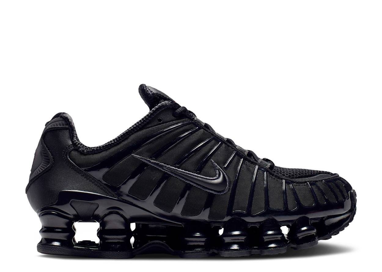 The Nike Shox TL 'Black Max Orange' (WMNS) brings a nocturnal twist to the classic silhouette, featuring a sleek Black/Black-Metallic Hematite-Max Orange colourway. Designed for women, this sneaker is crafted from a blend of mesh and nylon satin, offering a lightweight, breathable fit with a padded collar and modified upper cage. The bold max orange branding on the tongue and heel stands out against the black upper, while the full-length shox columns provide responsive cushioning from heel to toe. The standout feature is the unique black color scheme, enhanced by ballistic mesh and a glossy TPU overlay.