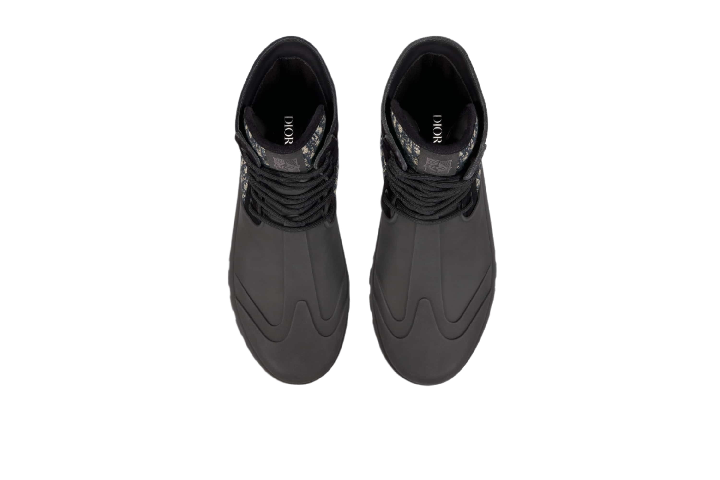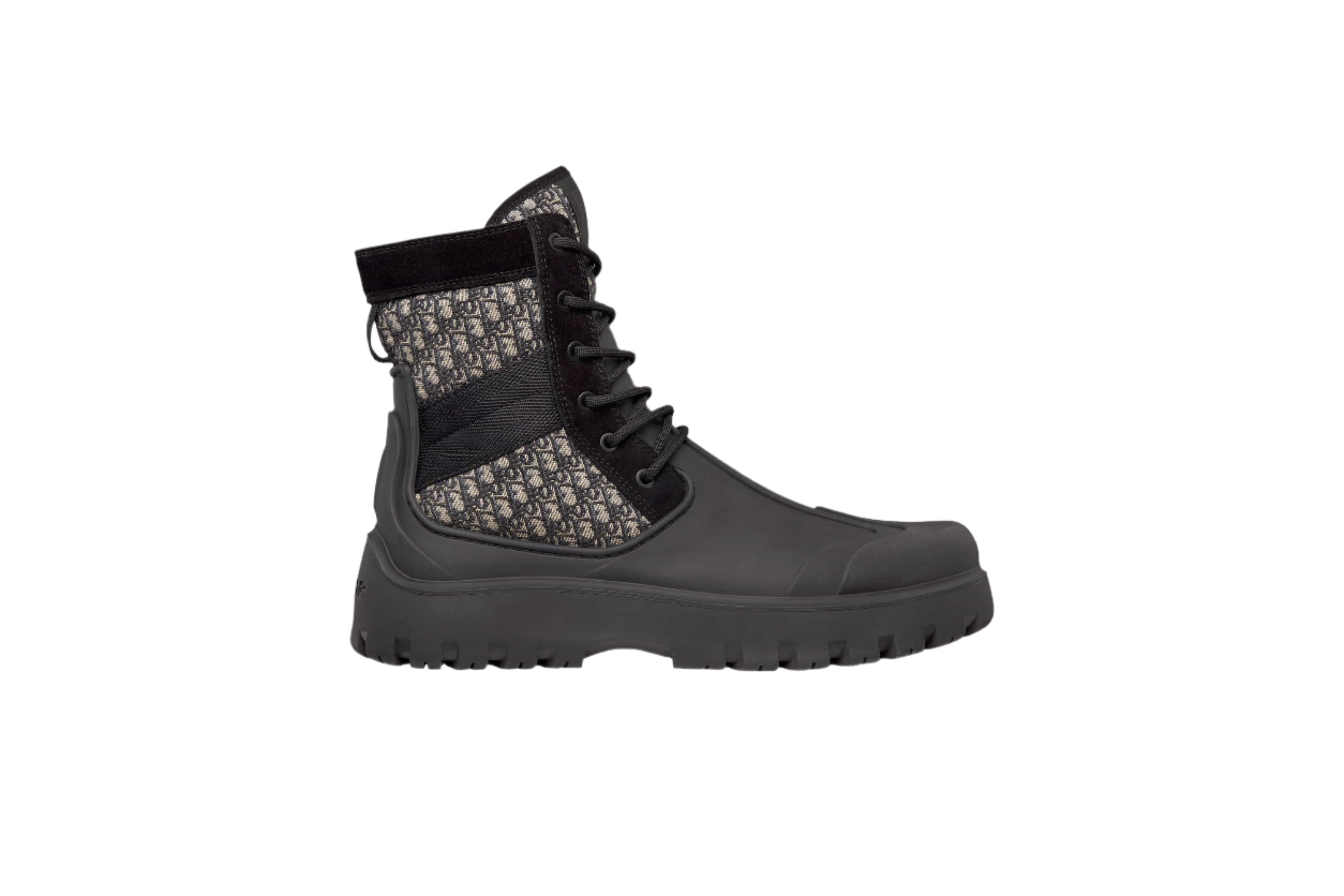 Constructed from durable matte black rubber, the Dior Garden Lace-Up Ankle Boots feature utilitarian-inspired detailing and tonal Dior Oblique branding—bringing rugged function to a high-fashion silhouette