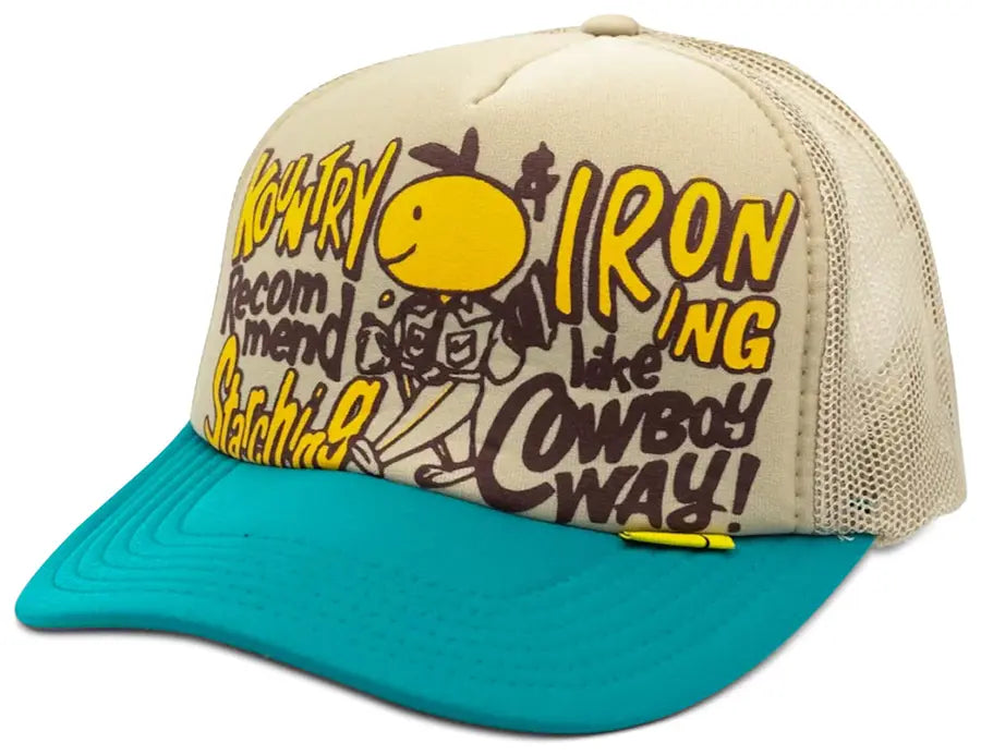 Add a touch of vintage flair with this Kapital Kountry Coneycowbowy Trucker Cap in Beige and Turquoise. Featuring a classic trucker silhouette and a playful twist, this cap blends nostalgia with street-ready vibes for standout style.