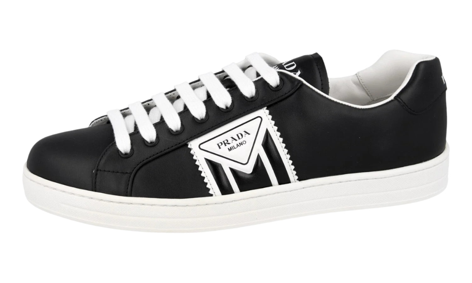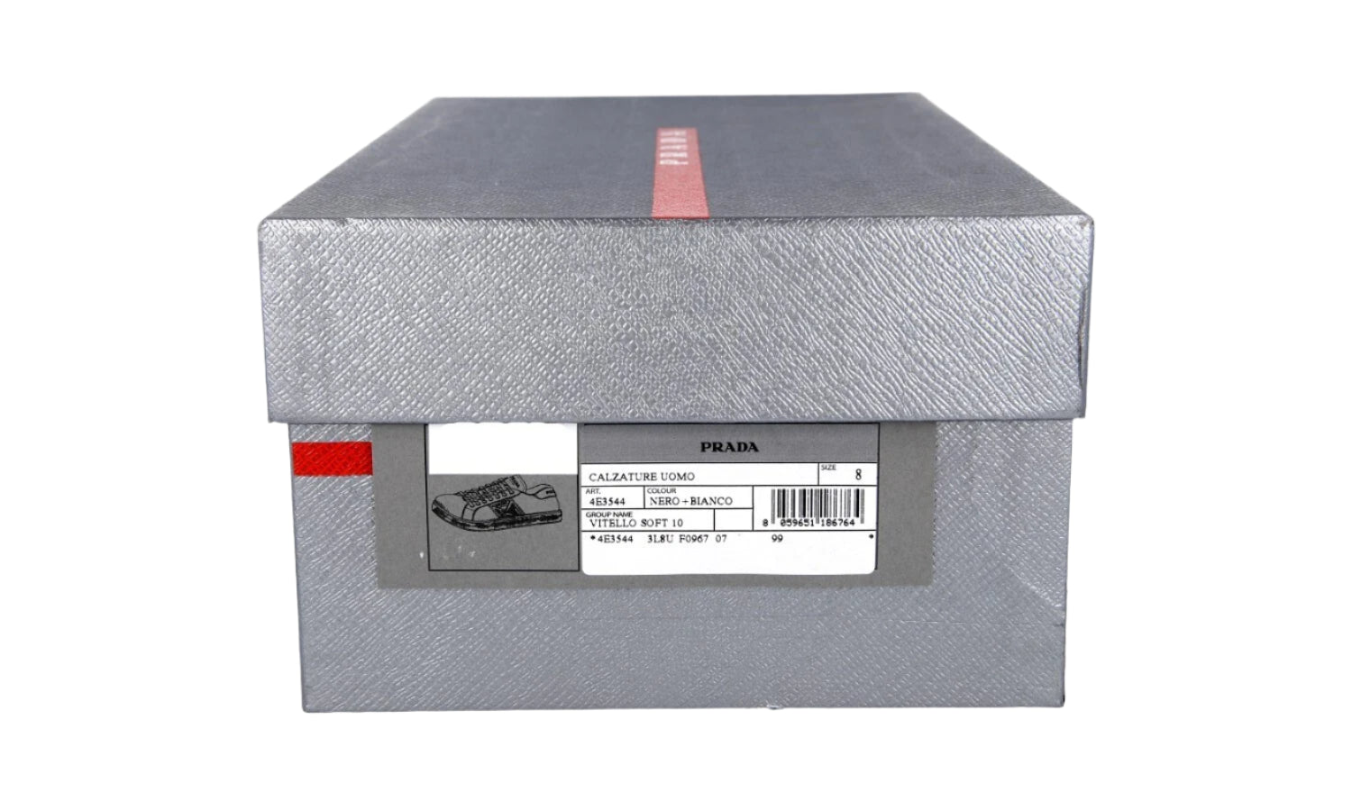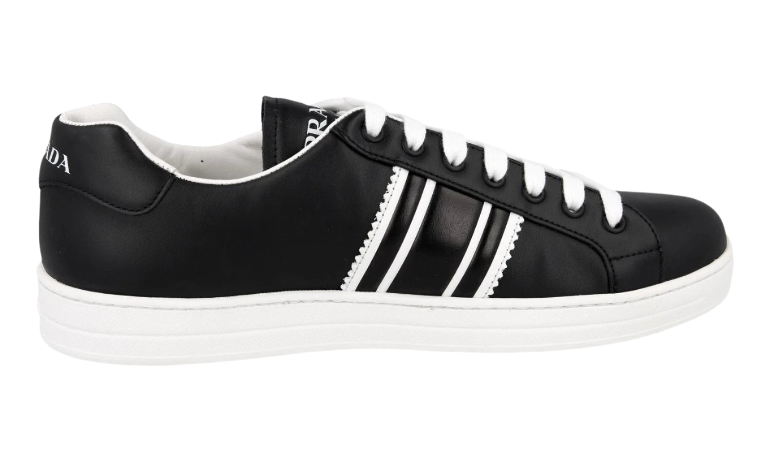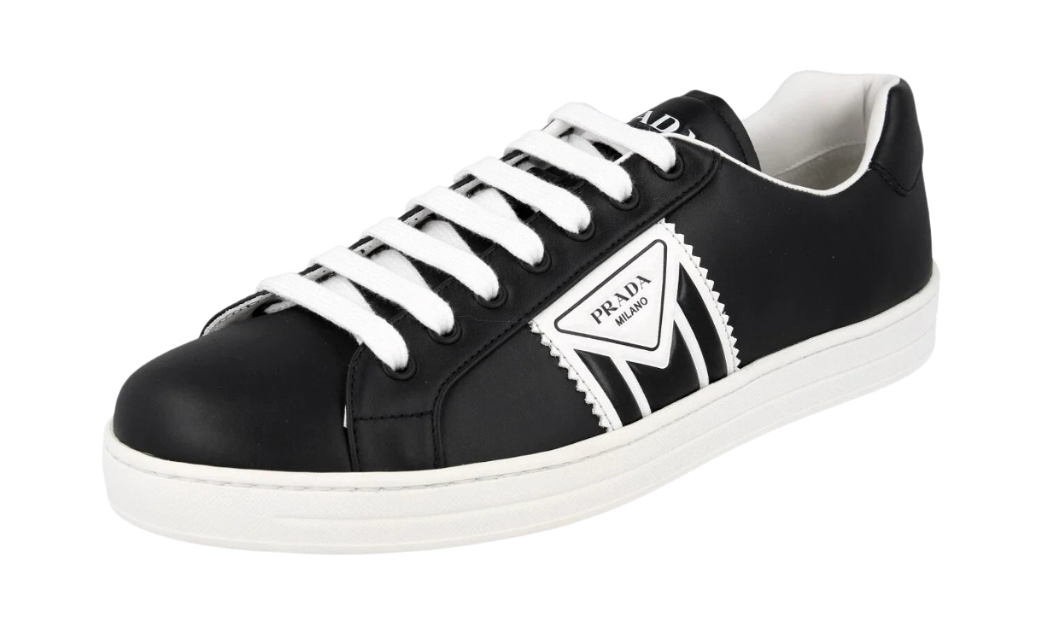 These shoes are made of full-grain Italian calfskin leather in a sleek black and white palette. Classic pair featuring the iconic Prada enamel triangle logo on the side, “Prada Milano” lettering on the tongue, and logo embossed on the outsole. This pair has a light rubber sole for comfort with logo accenting for luxury flair. Prada sizing fit: many find them comfortable right out of the box with minimal break-in required.