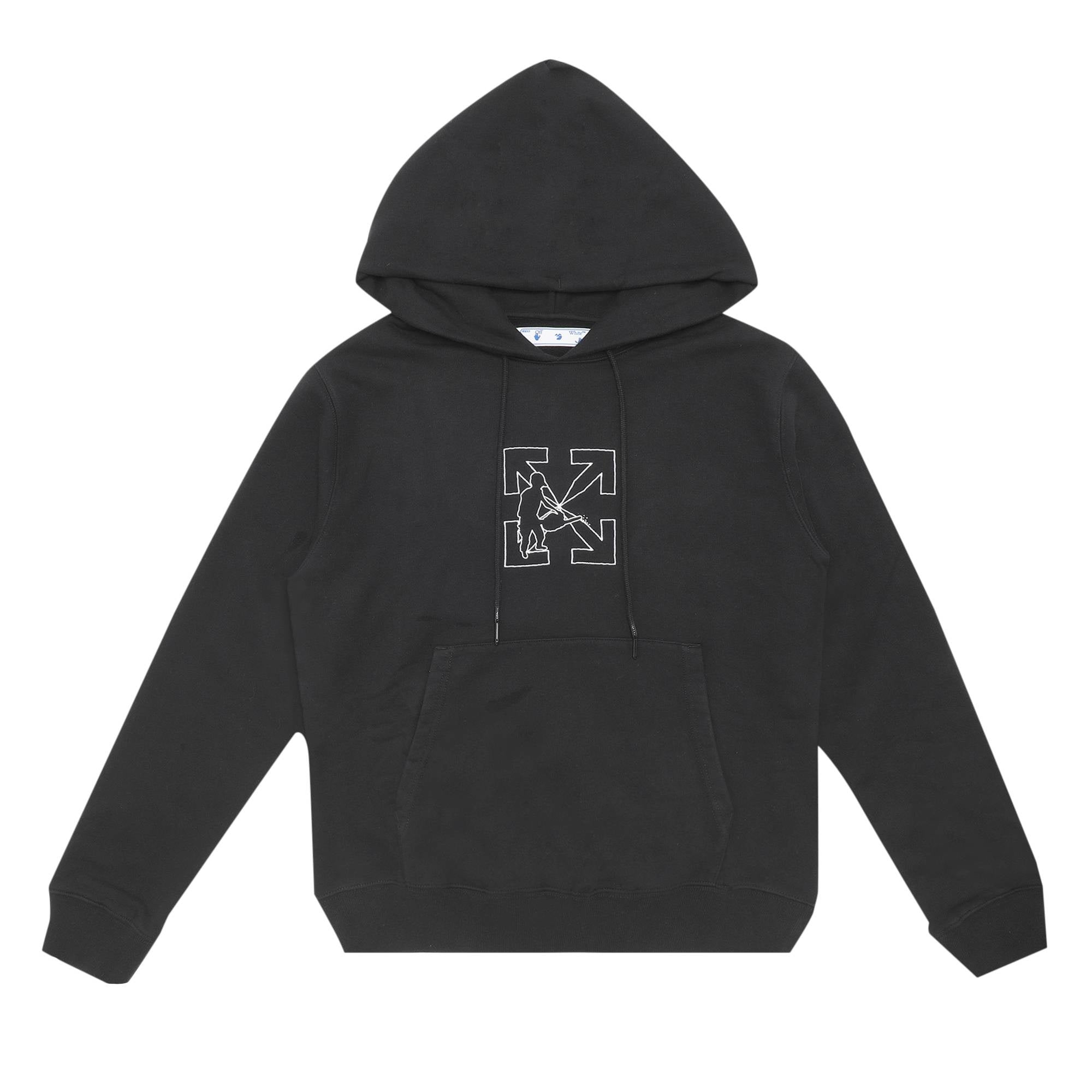 Slim-fit hoodie in black with white Off-White logo graphics across the chest and sleeves for a standout streetwear aesthetic.