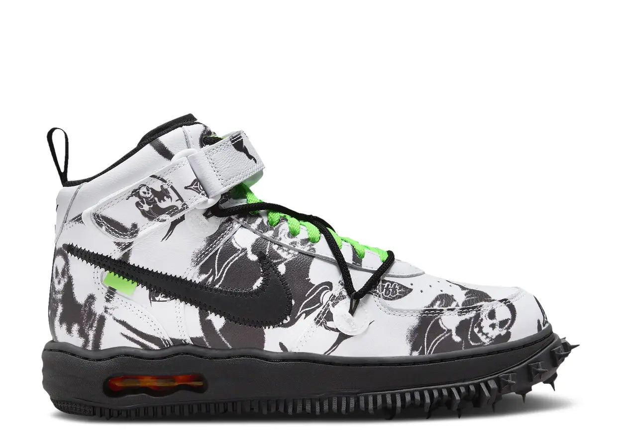 The Nike Air Force 1 Mid SP Off-White ‘Grim Reaper’ delivers a bold graphic take on the classic mid-top silhouette, created through Nike’s collaboration with Off-White. The leather upper features a white base covered in black Grim Reaper graphics, with perforations at the toe for added breathability. A black Swoosh appears on each side, accented by lime green tag details, while the ankle strap continues the Grim Reaper motif. Lime green laces add contrast, complemented by Nike Air branding on the heel collar and Off-White text printed on the medial side. The design is finished with a spiked black rubber outsole that reinforces the shoe’s dark aesthetic.