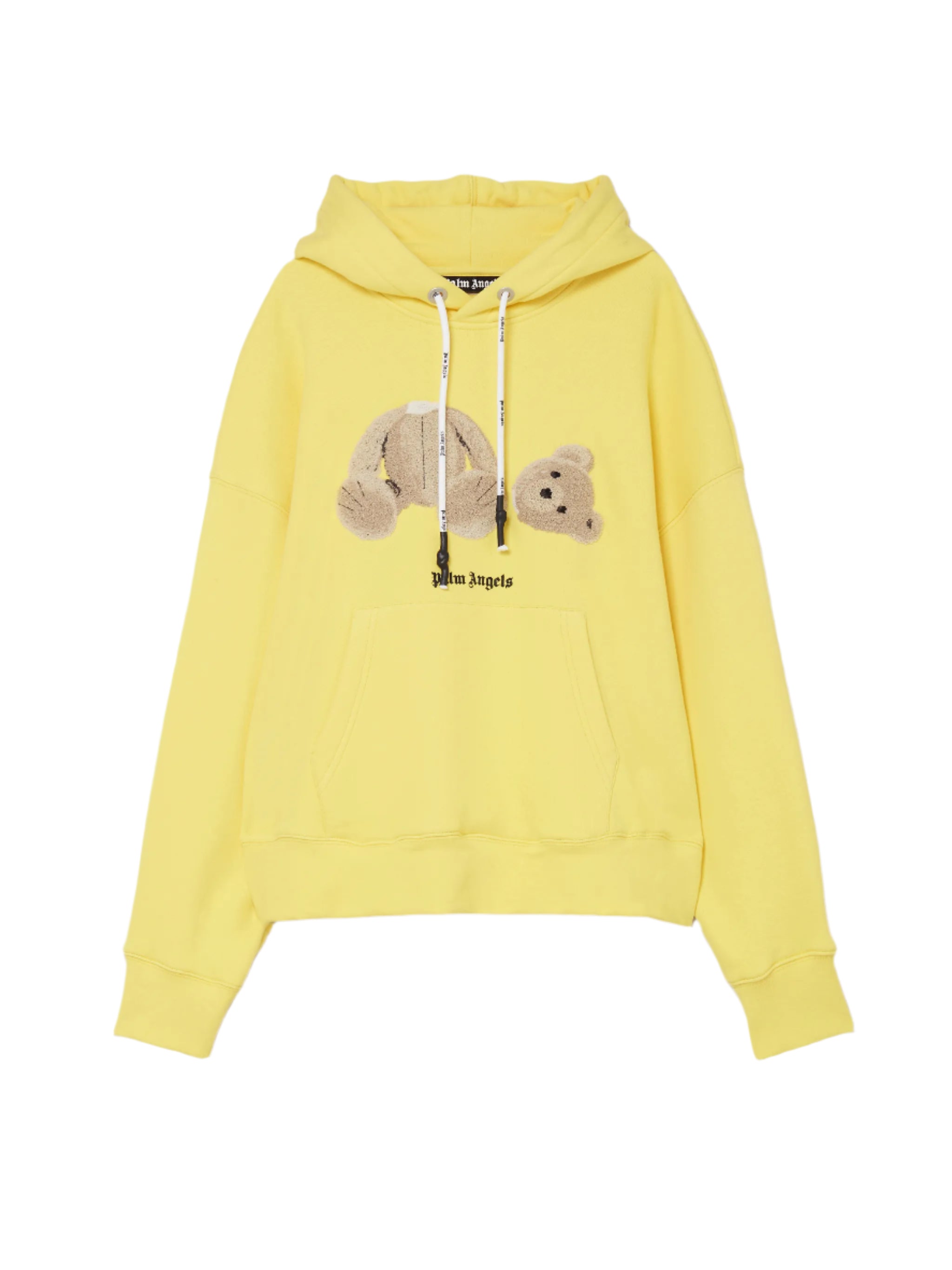 • Classic pullover hoodie in bright yellow with ribbed cuffs and hem, kangaroo pocket, and the iconic deconstructed teddy bear graphic paired with Palm Angels branding.