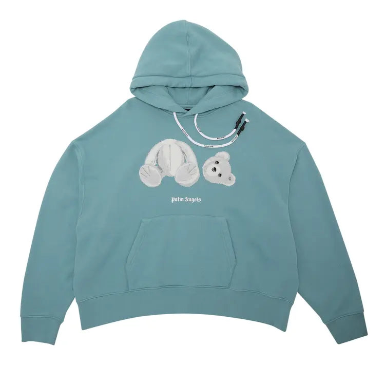 Pullover hoodie in aqua marine with ribbed trims, kangaroo pocket, and the signature Palm Angels split teddy bear motif — updated with an icy, frosted bear design for unique character.