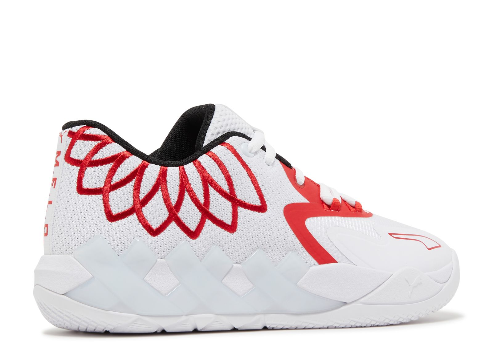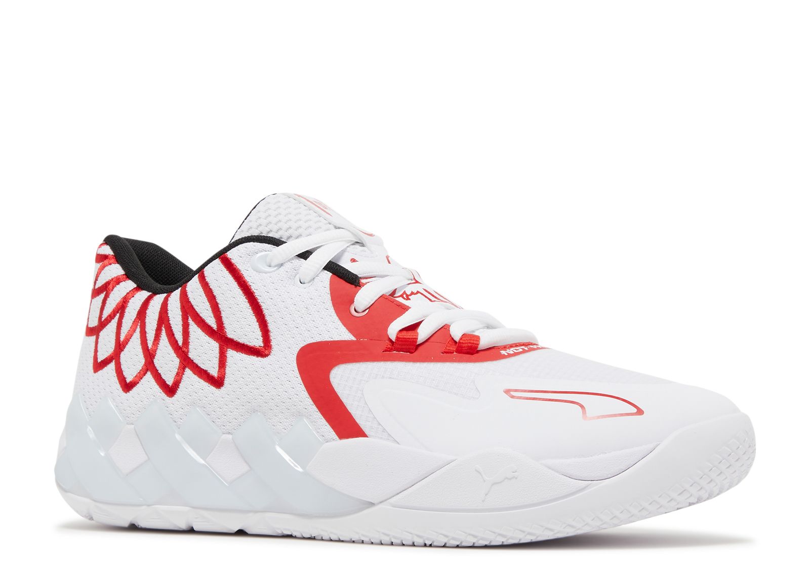 The PUMA MB.01 ‘Risk Red,’ from the ‘Team Colours’ collection, features a white monomesh upper with red accents on the collar. It includes a ‘1 of 1’ tongue tag and a no-sew forefoot overlay with LaMelo Ball's ‘Not From Here’ motto. The shiny support frame houses a nitro foam midsole for a soft, responsive court feel.