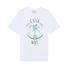 The Casablanca Statue En Marbre Printed T-shirt in 'White' is a short-sleeve style crafted from organic cotton, featuring seasonal artwork inspired by Art Deco. The design pays homage to a sculptural figure of a lady holding two tennis balls, complemented by tennis racket and laurel motifs. Finished with a classic crew neckline and the Casa Way logo.