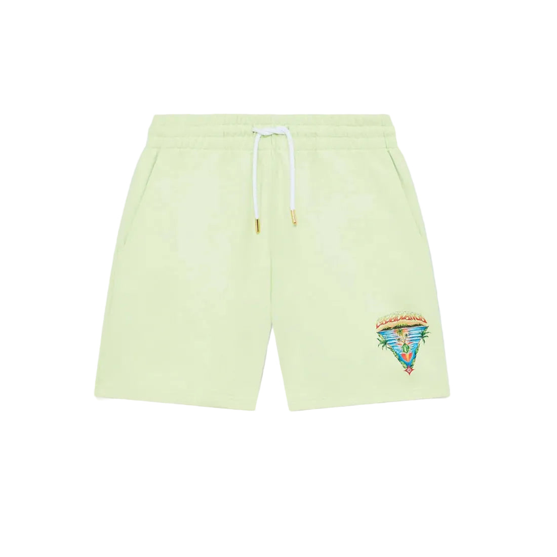 The Casablanca Innocence Triangle Sweatshort in 'Green' features a sunset ocean scene with a central island, illustrated in a style inspired by classic surf T-shirt artwork. The design captures the warmth of golden hour over tropical waters, presenting an idealised beachscape through the house’s refined sport-leisure lens.