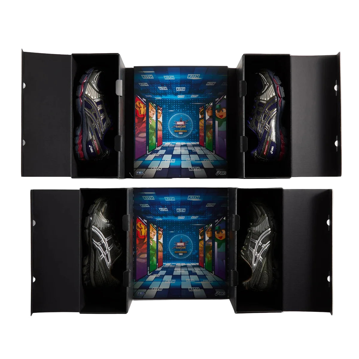 The Kith x Marvel x Asics Gel-Kayano 12.1 Marvel vs. Capcom Captain America vs. Guile Sealed Box features two pairs inspired by Marvel’s Captain America and Capcom’s Guile. Presented in a fully custom double box, it showcases exclusive Marvel vs. Capcom artwork and Kith branding, delivering a retro arcade-inspired unboxing experience. Each box also includes a gift-with-purchase comic book.