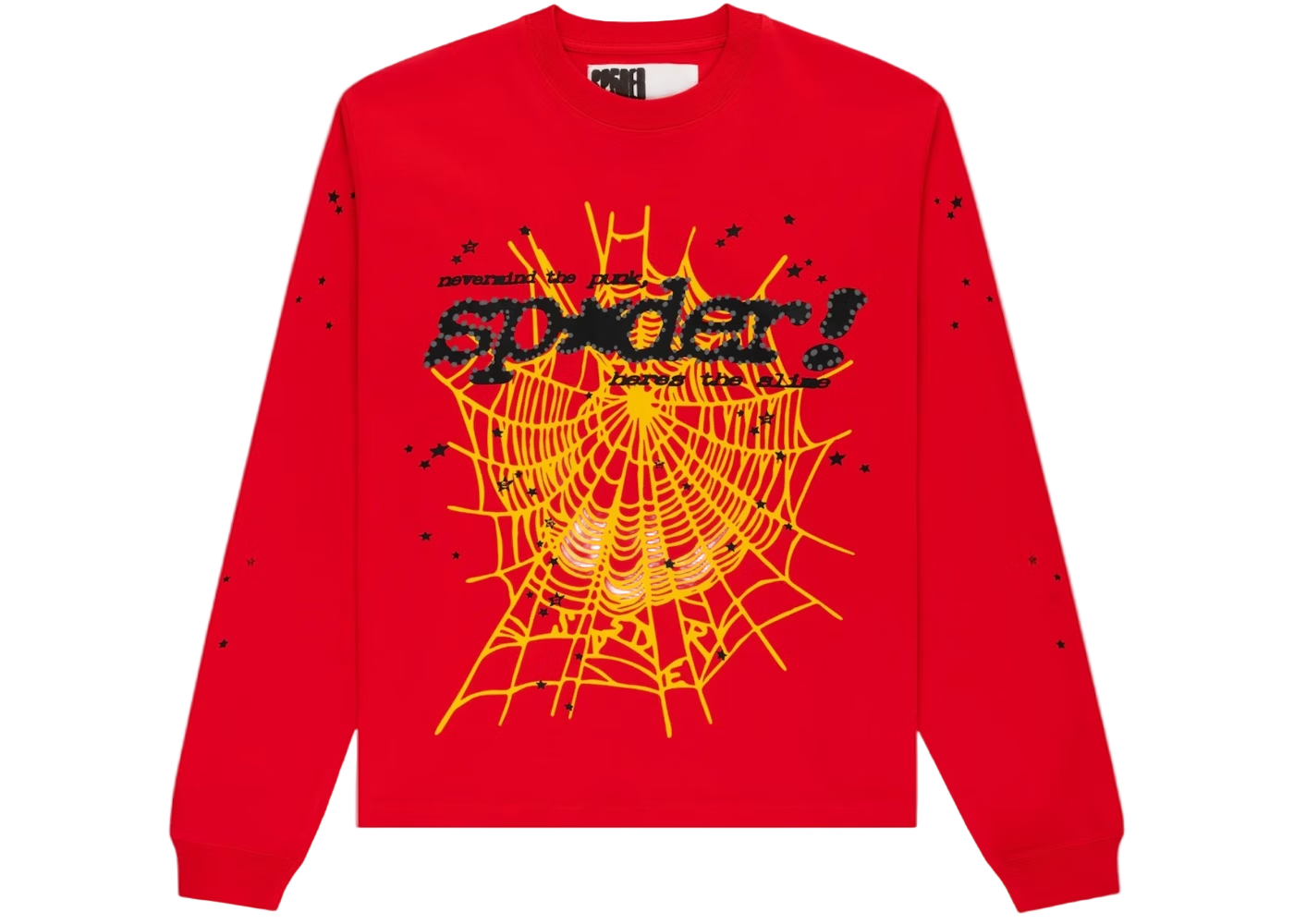 Vibrant red base with Sp5der’s iconic front “Punk” spider-web motif and logo graphic