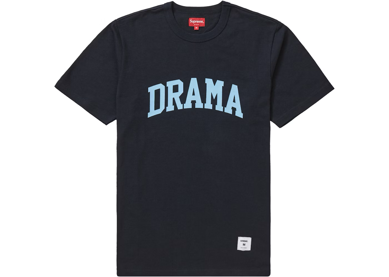 The Supreme Drama Tee in 'Navy Blue' is a standout piece from Supreme's Fall/Winter 2019 collection. This t-shirt features a bold "DRAMA" graphic across the chest, capturing the brand's signature streetwear aesthetic.