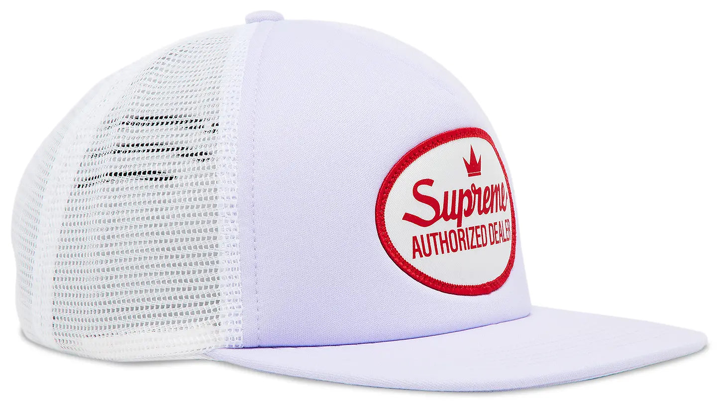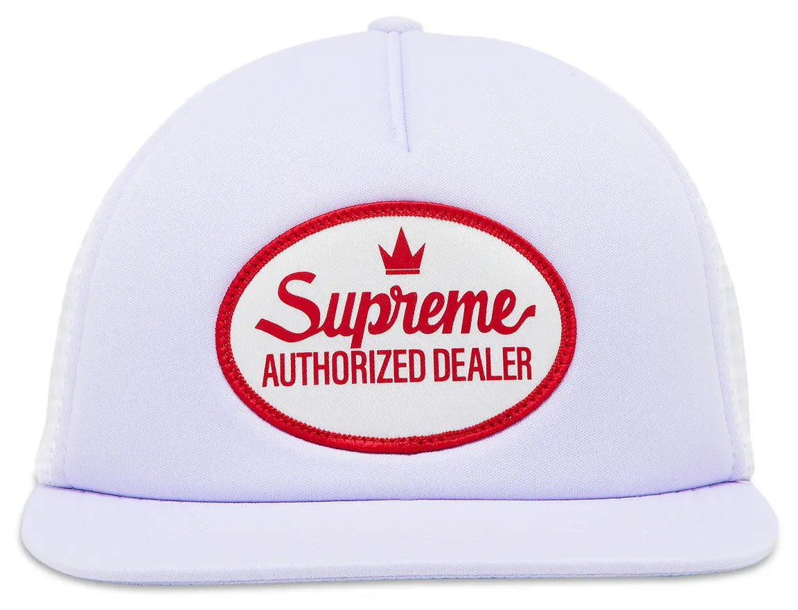 Embellished with a printed 'Authorized Dealer' logo patch on the front and an embroidered Supreme logo on the back