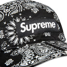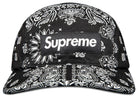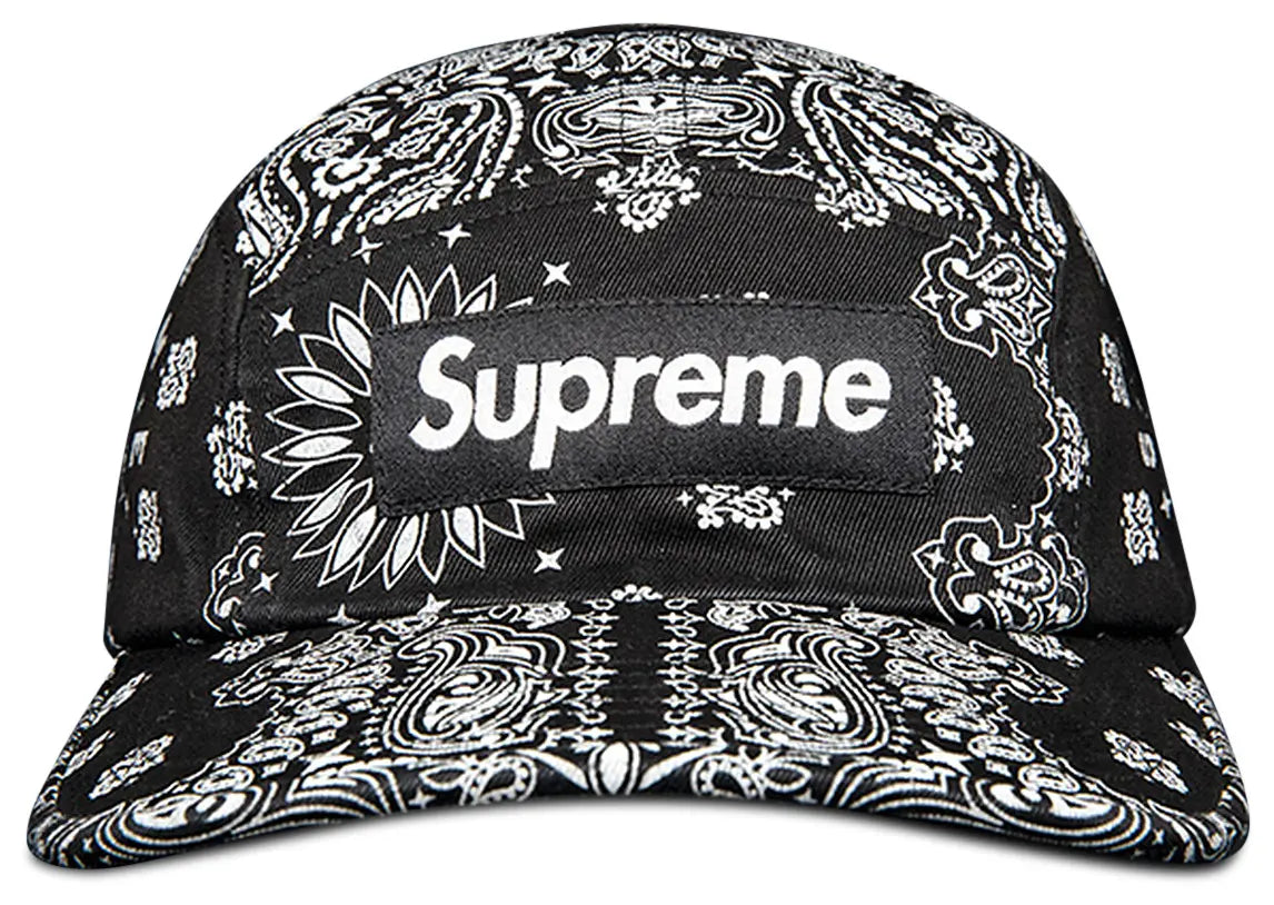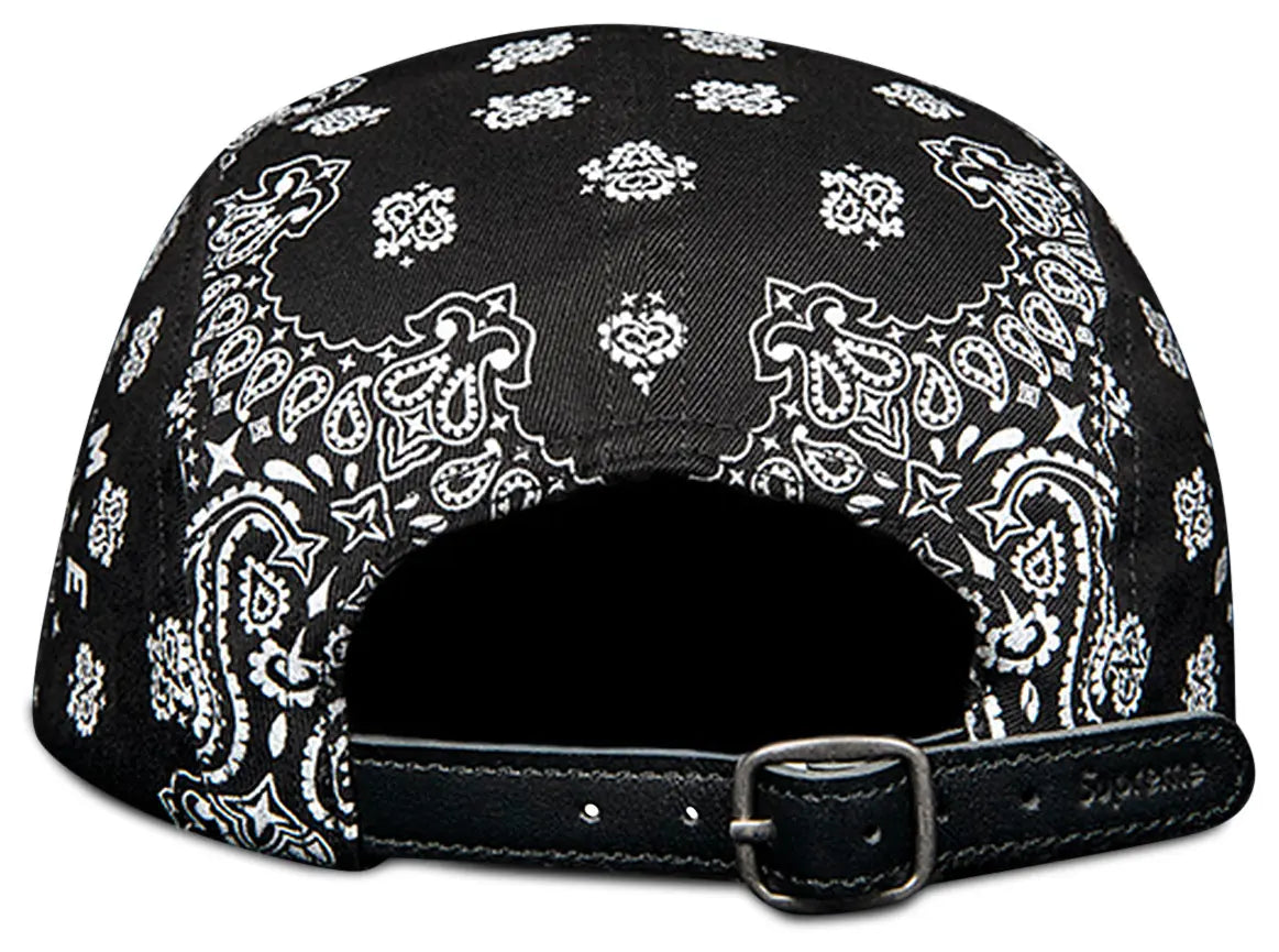 The Supreme Bandana Camp Cap in 'Black White' puts a streetwear twist on a classic camp silhouette, featuring all-over bandana print and signature Supreme branding. Crafted with a structured crown and adjustable strap, this cap delivers standout visual appeal and effortless everyday wear — perfect for layering into casual and urban outfits.