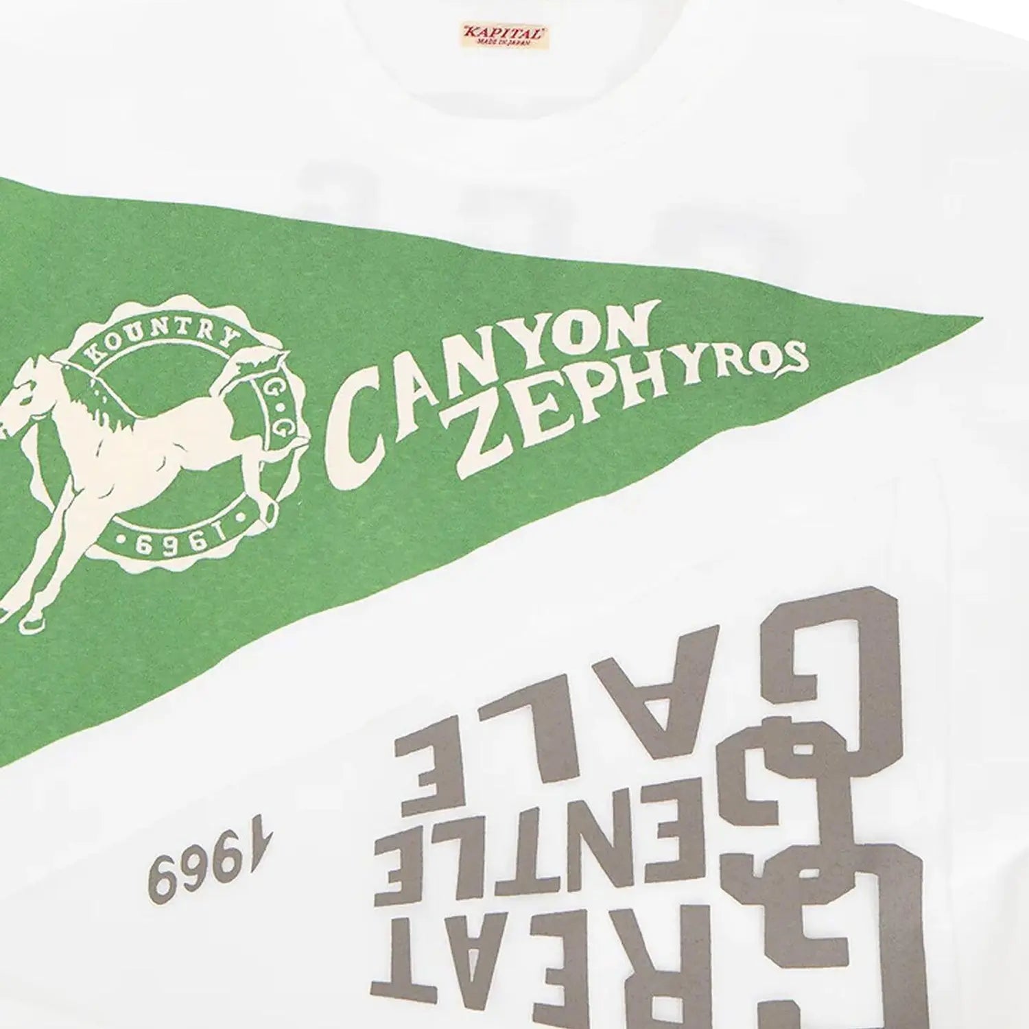 This unique Kapital crew-neck tee combines burnout fabric techniques with playful graphic motifs and opal sheeting for a standout aesthetic.