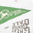 The front features layered pennant graphics—some areas are semi-sheer via a burnout process, while others are raised in textured puff-print form for visual and tactile contrast. One pennant even appears on the back via extended burn-out technique