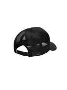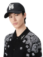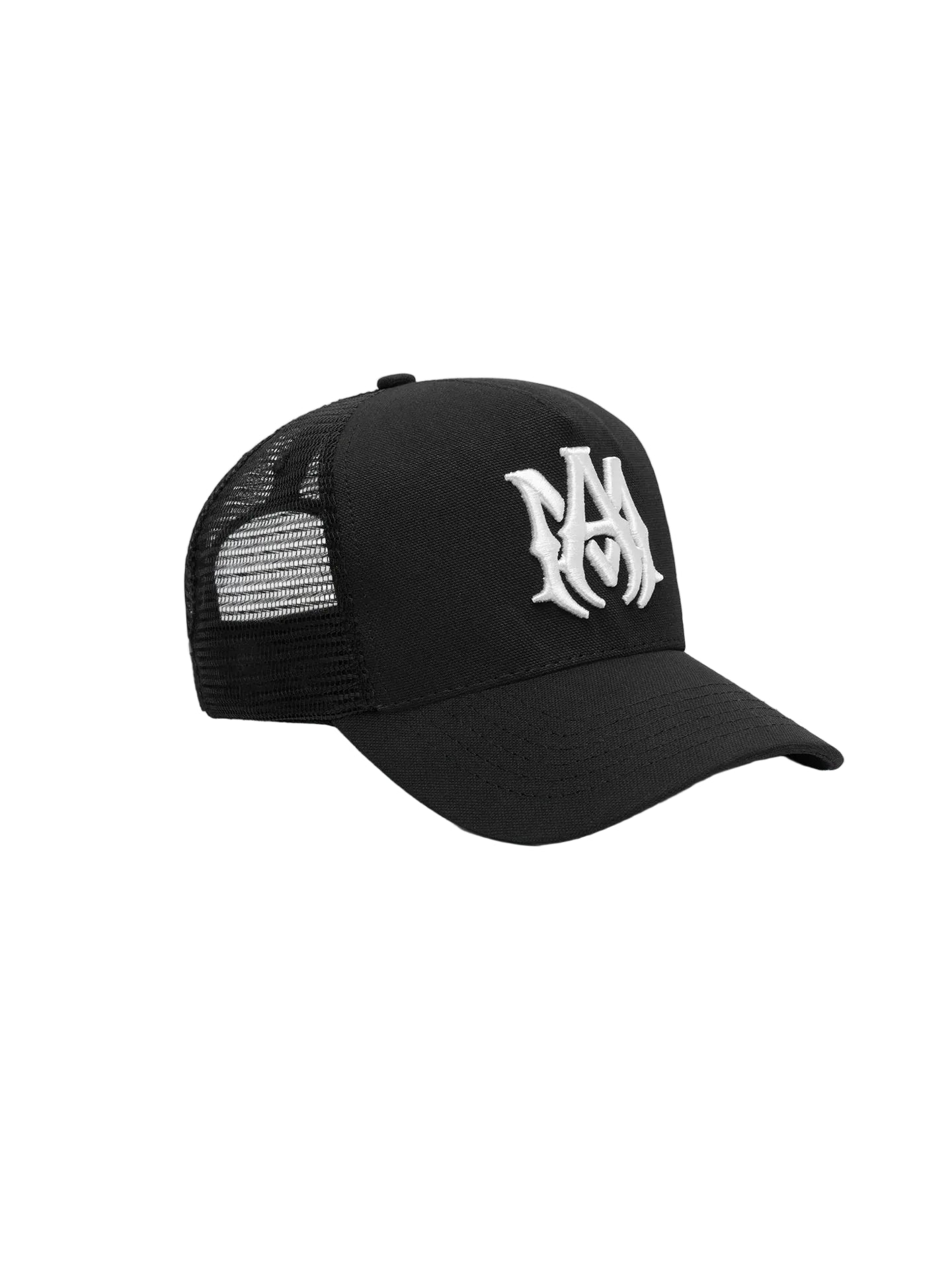 The canvas and mesh Amiri MA Logo Trucker Hat in 'Black White' features the brand’s signature MA embroidery, finished with a curved brim, embroidered eyelets, and an adjustable double snapback closure.